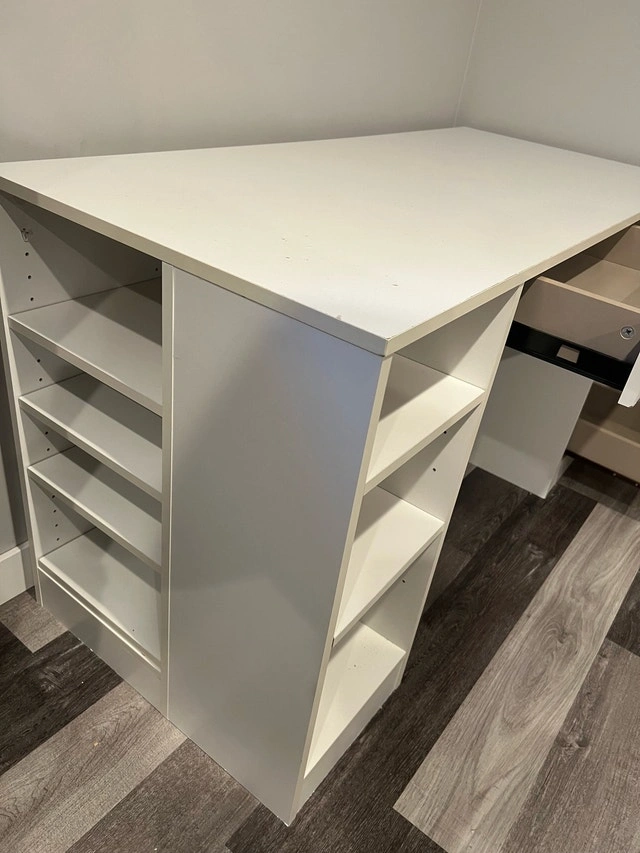 Great desk with lots of storage! Assembly is very easy and it is easy to move as it separates into 3 separate sections or you can take it all part. There is a few little marks.