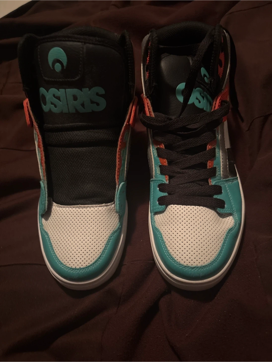 These Osiris high top sneakers are a stylish choice. They feature a mix of white, teal, black, and orange colour blocking. Lace-up closure for a secure fit.