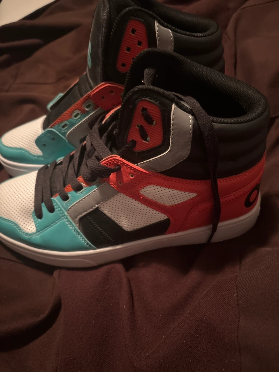 These Osiris high top sneakers are a stylish choice. They feature a mix of white, teal, black, and orange colour blocking. Lace-up closure for a secure fit.