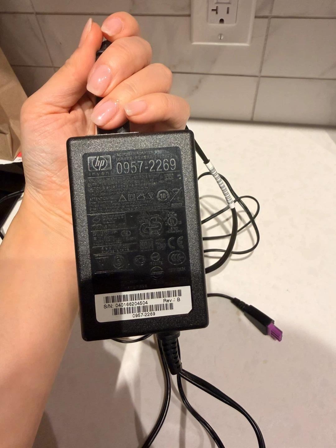 This is an HP power adapter with model number 0957-2269. It has a standard North American plug. The connector tip is purple.