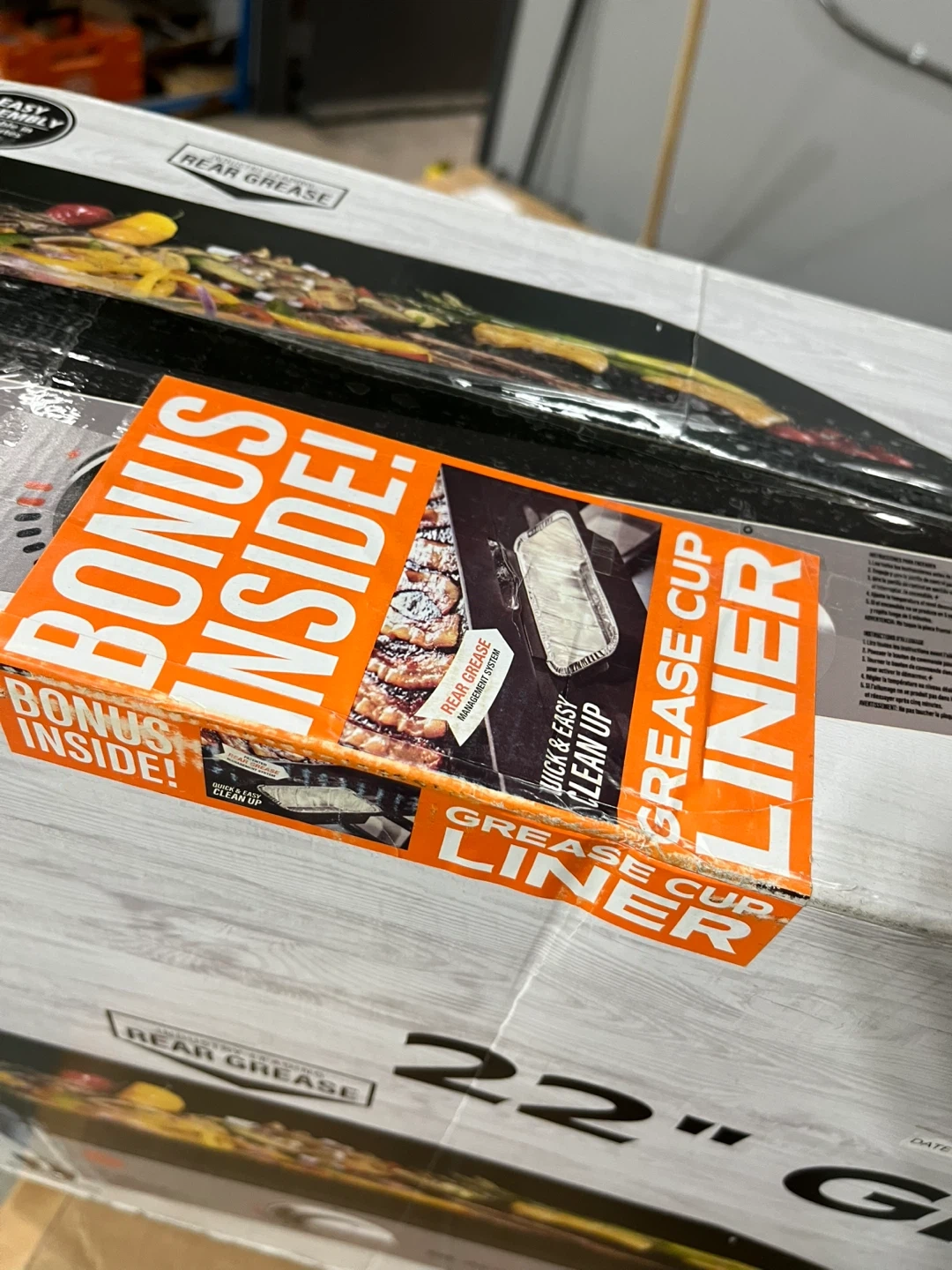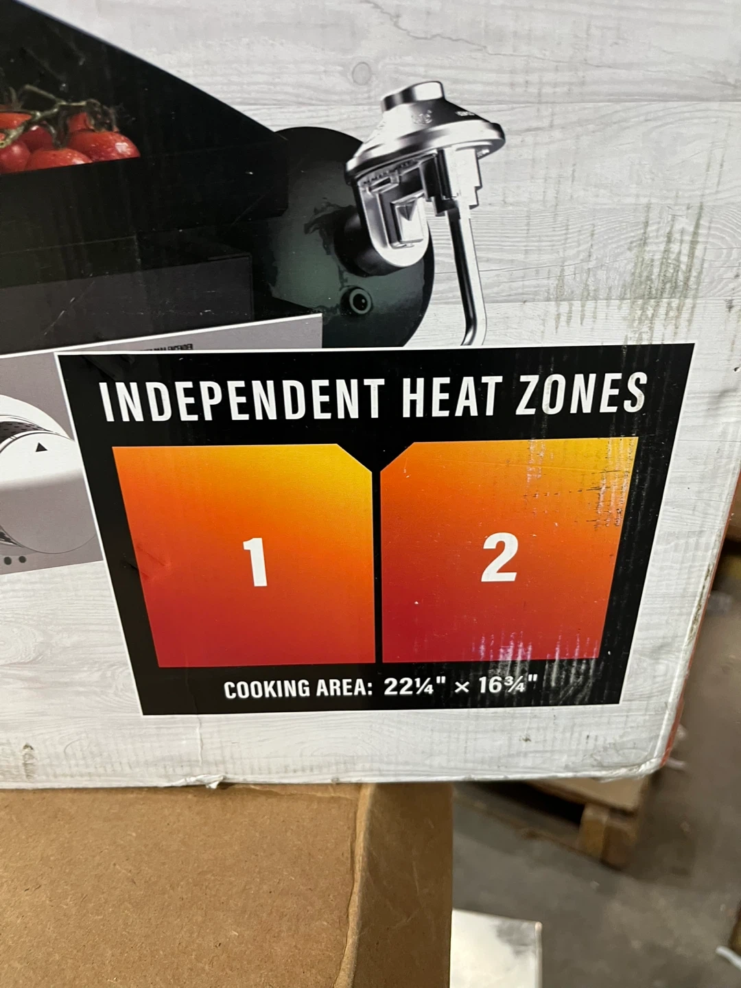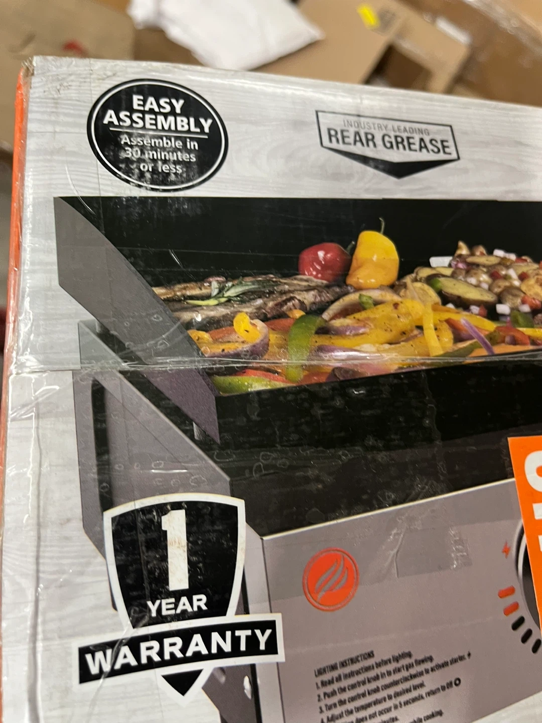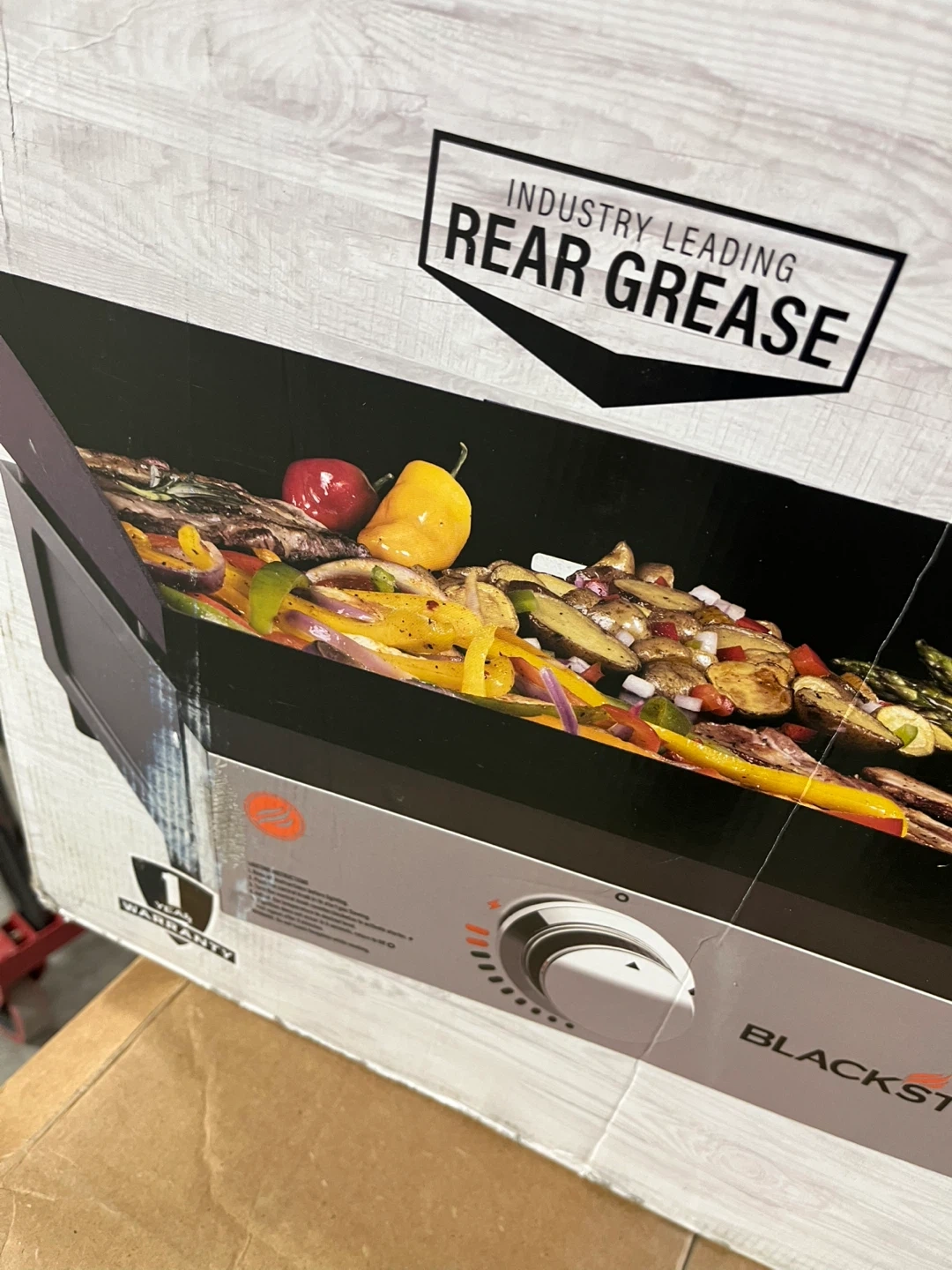 It's a Blackstone 22-inch griddle with independent heat zones. The cooking area is 22 1/4" x 16 1/4". It features industry-leading rear grease management and comes with a bonus grease cup liner inside. This griddle is easy to assemble in 30 minutes or less and includes a 1-year warranty.