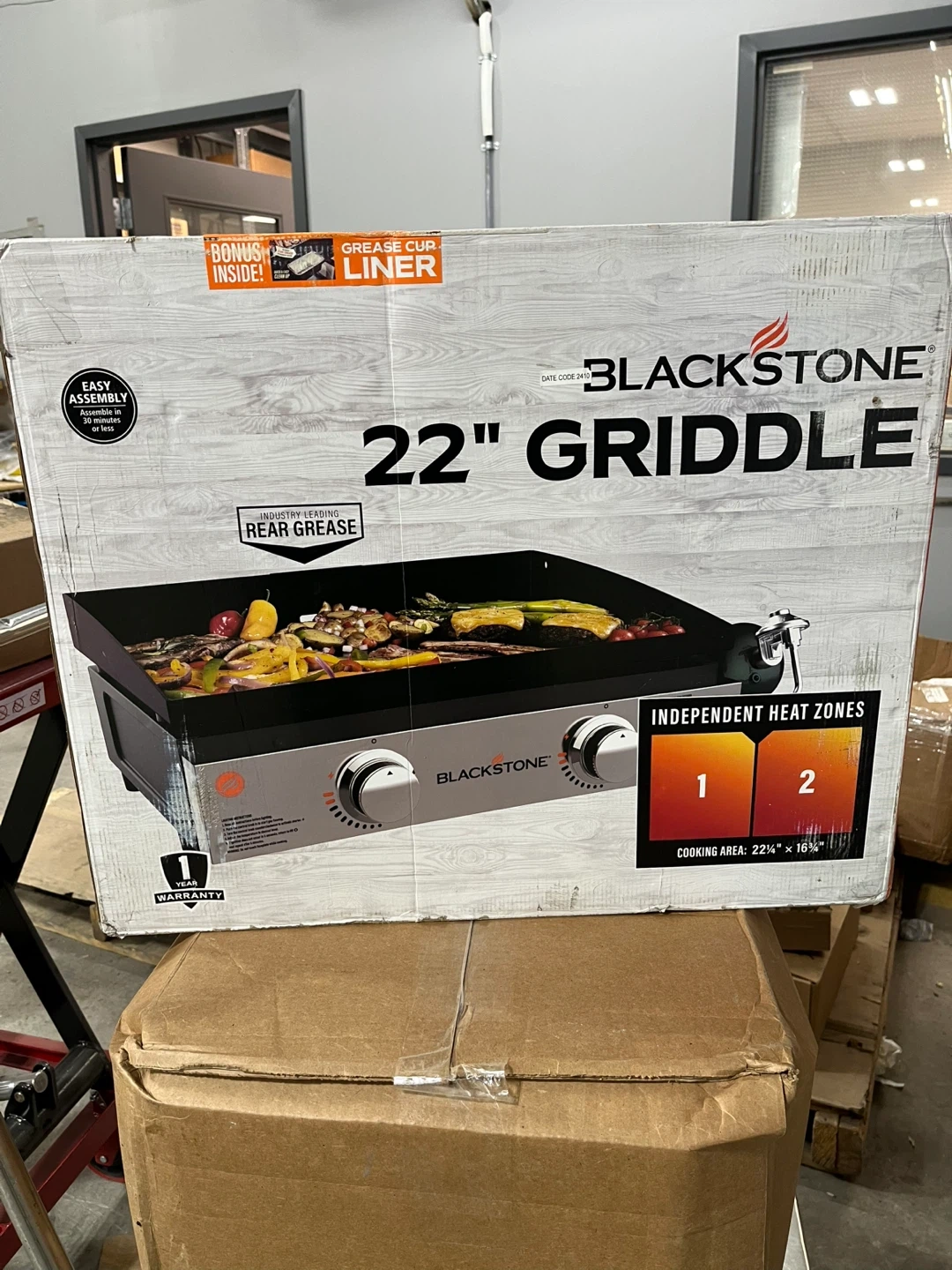 It's a Blackstone 22-inch griddle with independent heat zones. The cooking area is 22 1/4" x 16 1/4". It features industry-leading rear grease management and comes with a bonus grease cup liner inside. This griddle is easy to assemble in 30 minutes or less and includes a 1-year warranty.