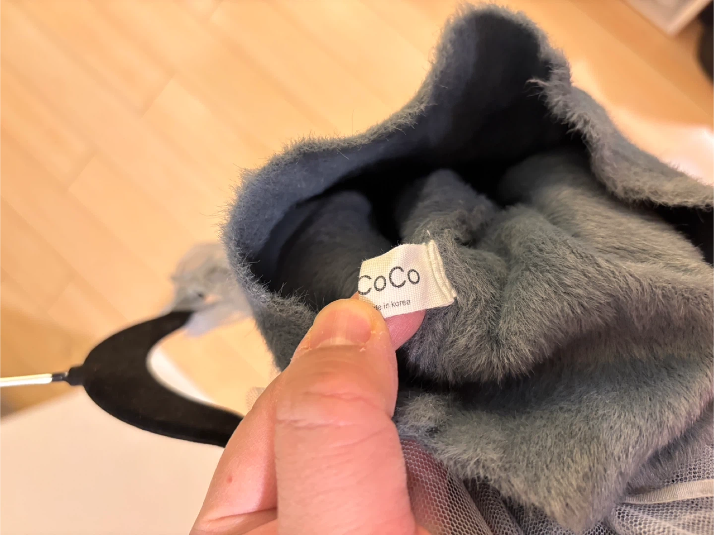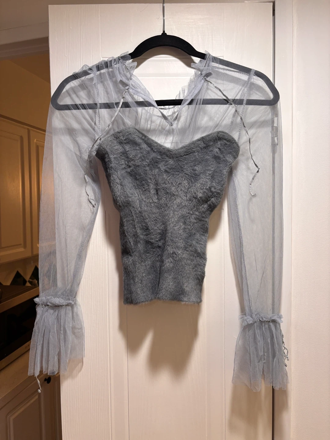 Grey mesh long-sleeve top with a faux fur corset detail. It has ruffled cuffs and neckline. Made in Korea.
