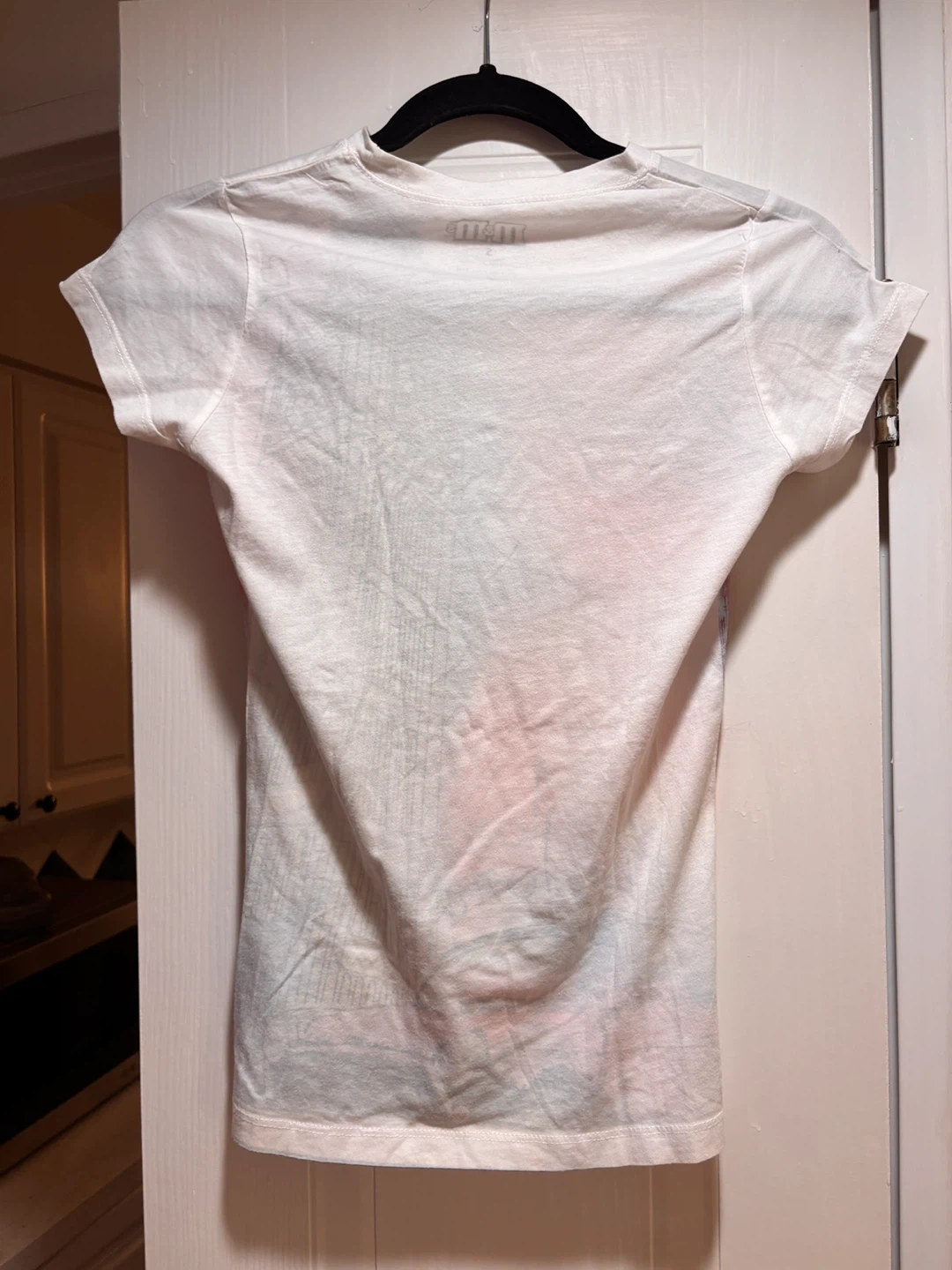 This is a white M&M's graphic t-shirt with a London theme. It's made from a 65% polyester and 35% cotton blend. This shirt is a size small.