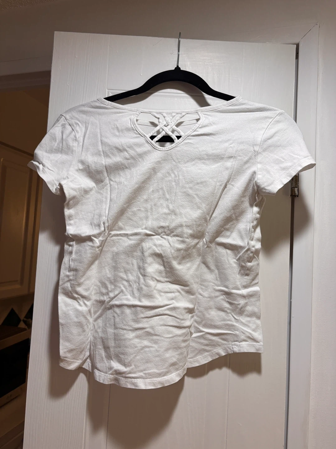 This is a white t-shirt with a cow graphic on the front. It has a criss-cross detail at the back neckline. Made from soft, breathable fabric.
