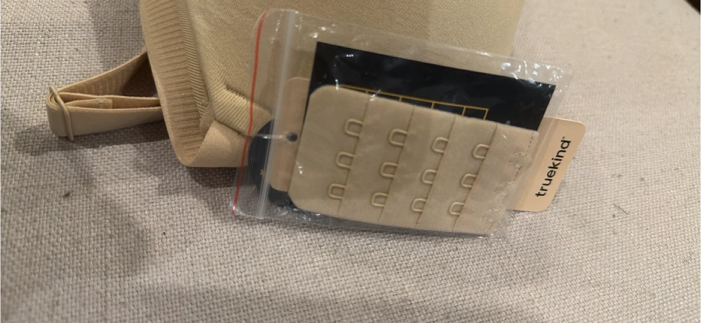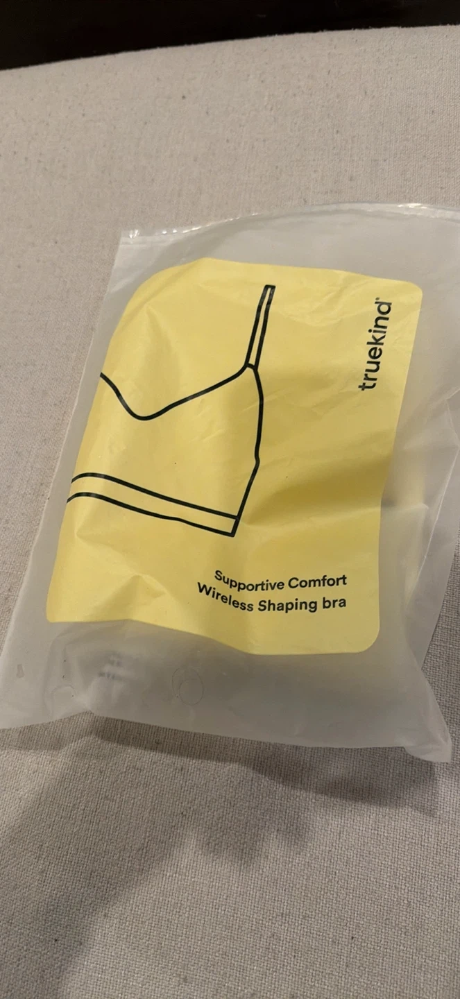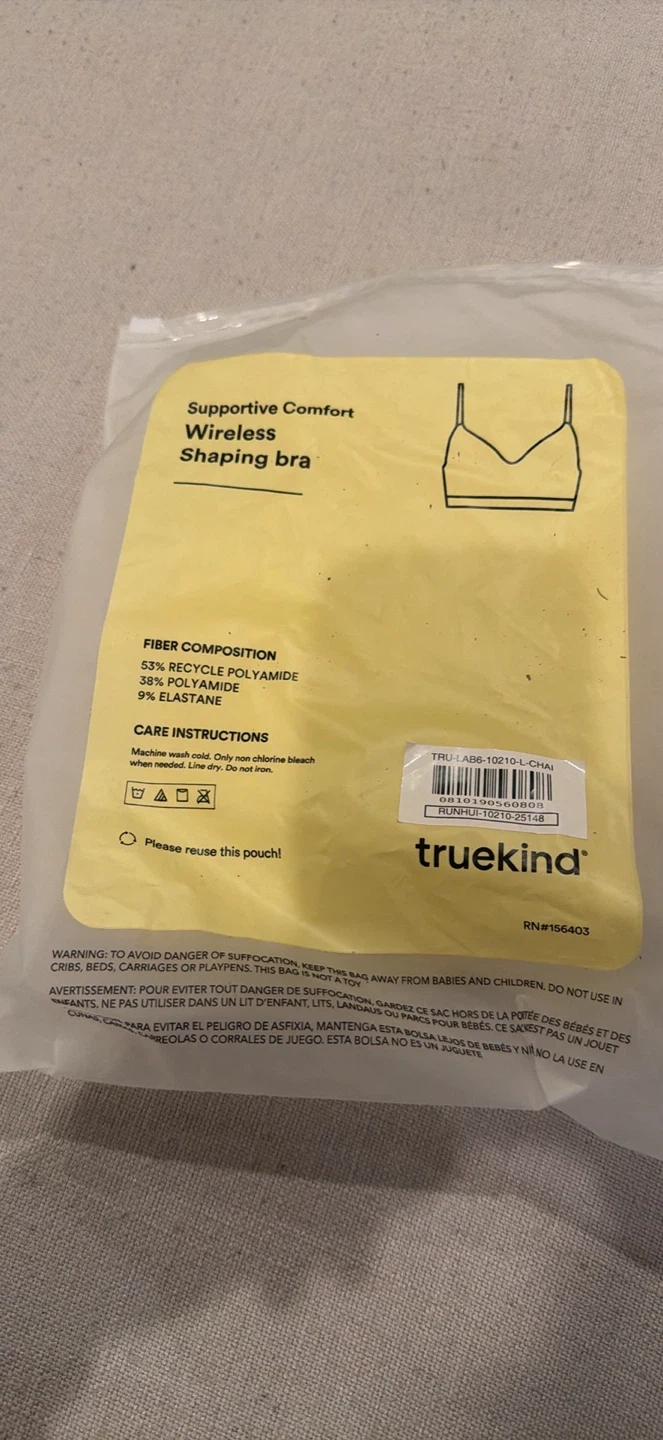 This Truekind bra offers supportive comfort and a wireless shaping design. It's made with 63% recycled polyamide, 38% polyamide, and 9% elastane. Includes a bra extender for added versatility.