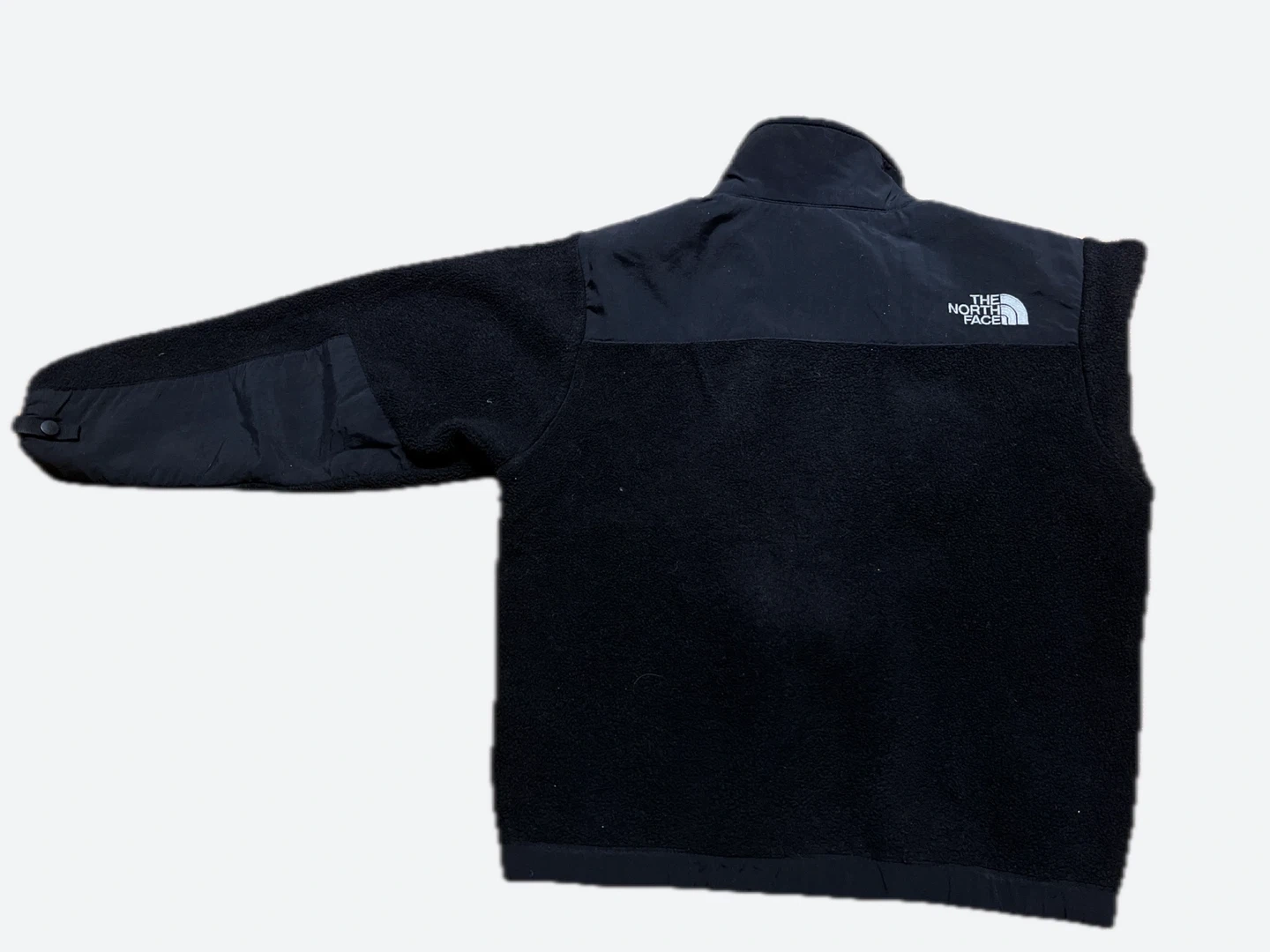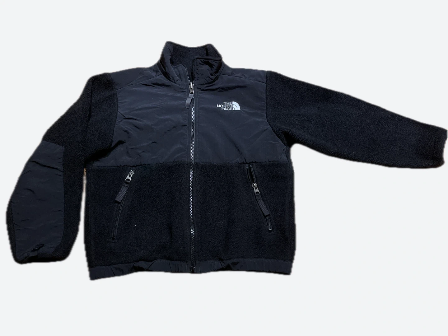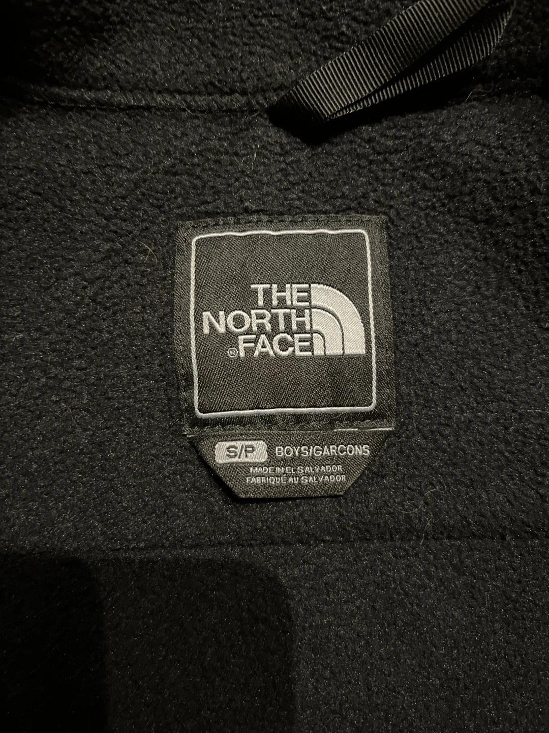 This is a black fleece jacket from The North Face. It's a boys' size S/P. The jacket is made of fleece material with nylon panels on the shoulders and sleeves. It features a full zip front and two zippered hand pockets. There’s a zipper damage on the bottom, but zipper can still fully close as seen in the picture and can be fix.