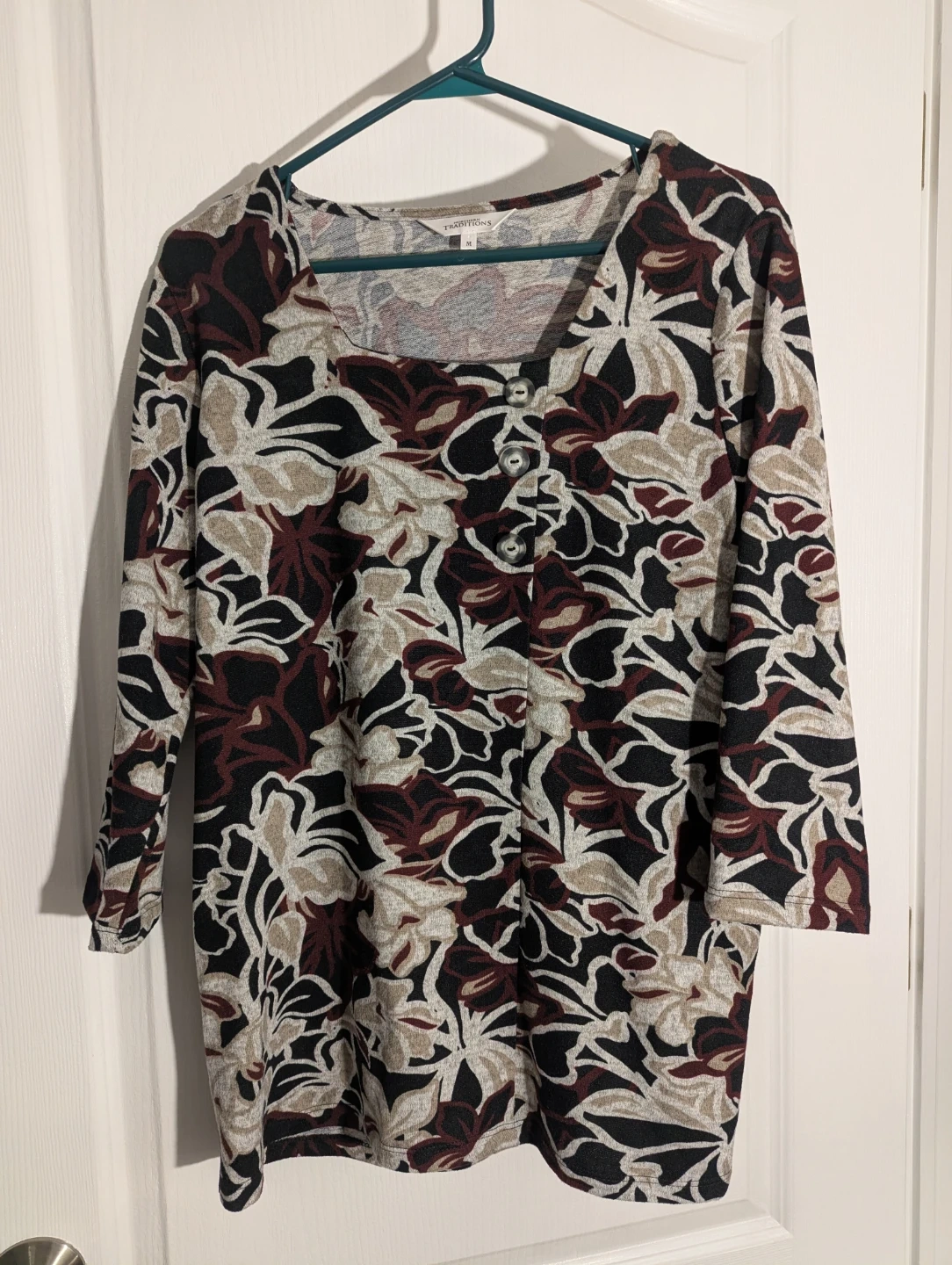 This Traditional top features a beautiful floral print with maroon, beige, and black accents. It's a size medium with 3/4 length sleeves and a button-up neckline.