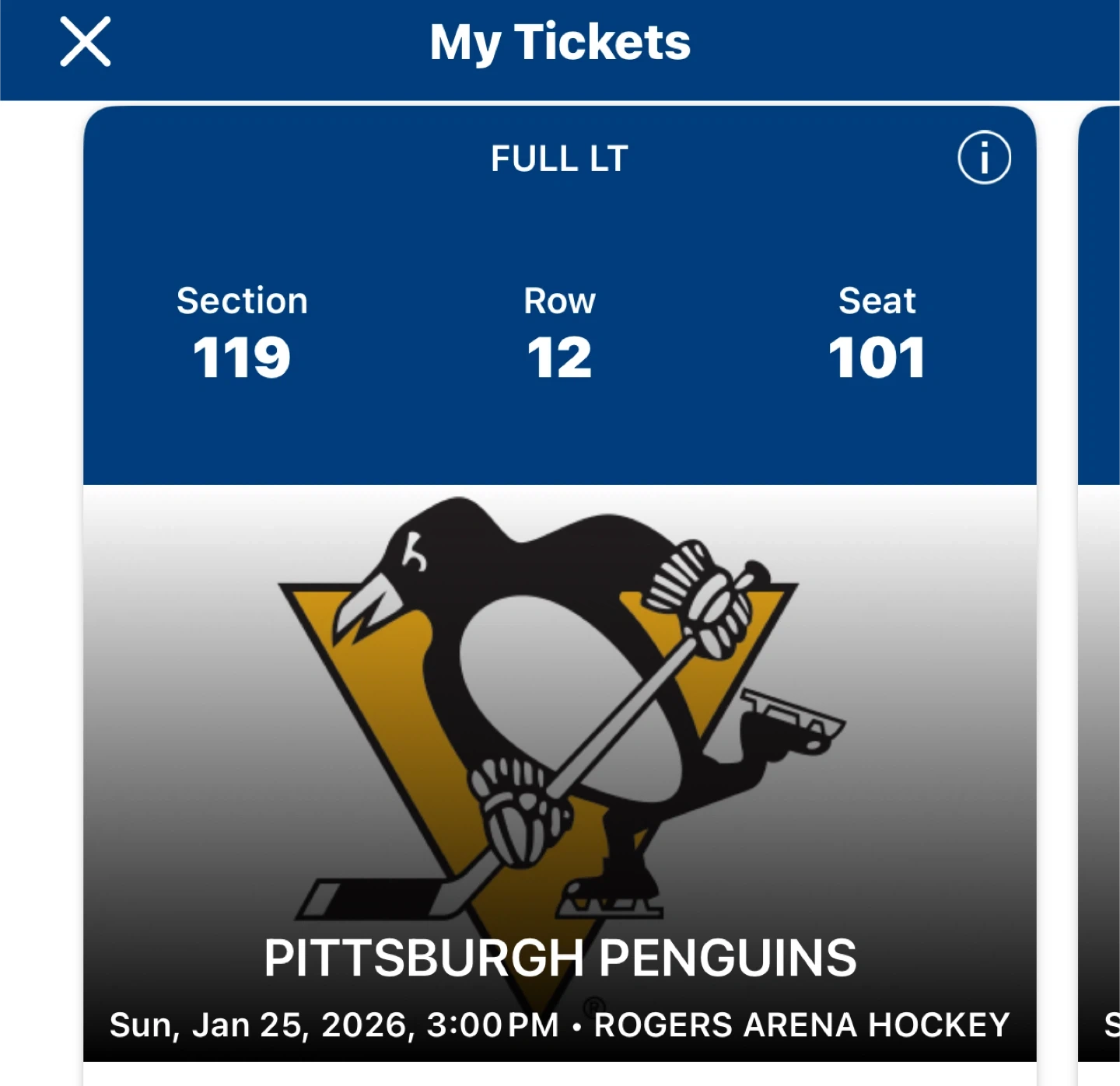 Two tickets for the Pittsburgh Penguins game on Sunday, Jan 25, 2026, at 3:00 PM at Rogers Arena. Seats are Section 119, Row 12, Seats 101 and 102. A great opportunity to see a hockey game!