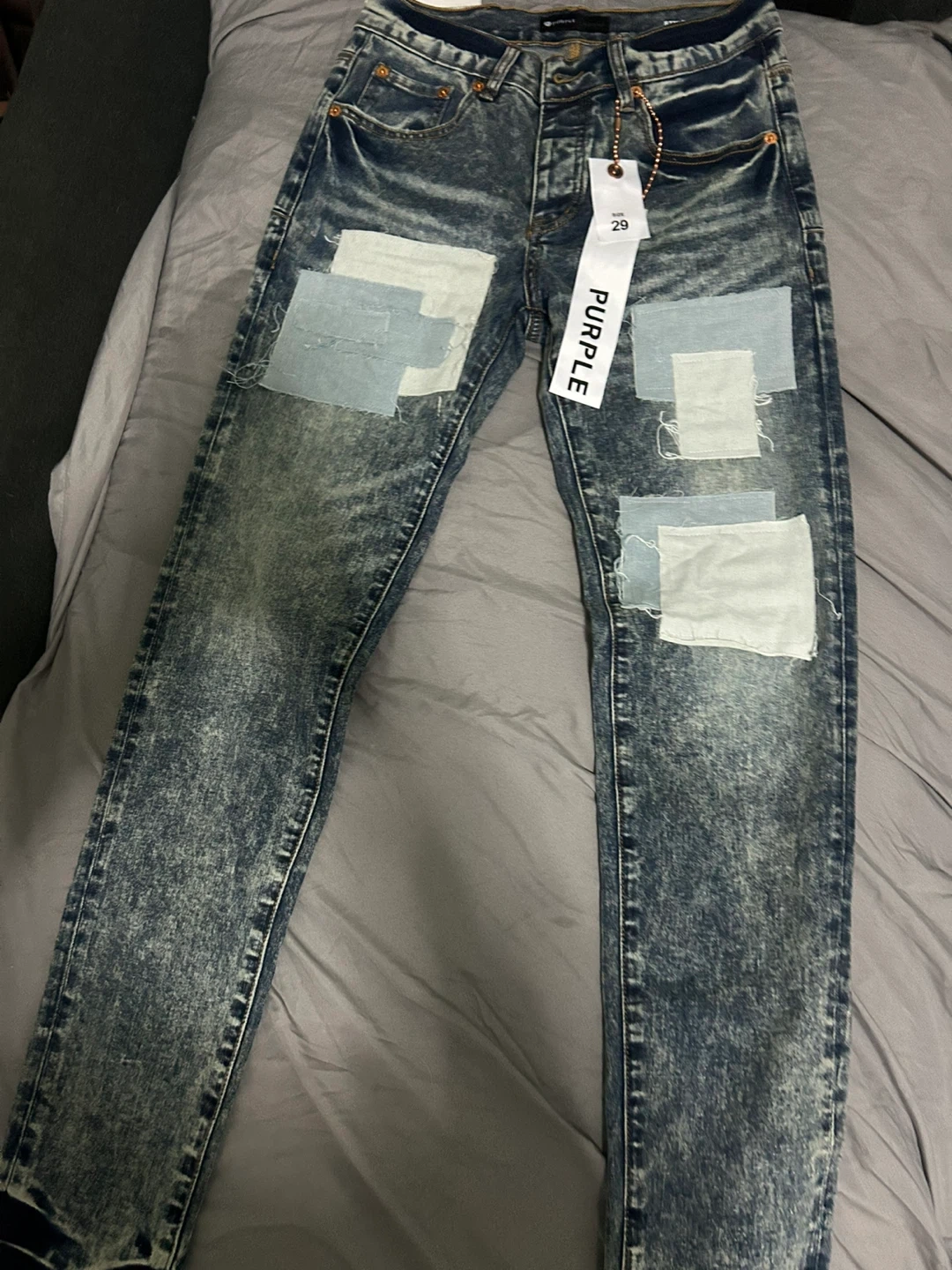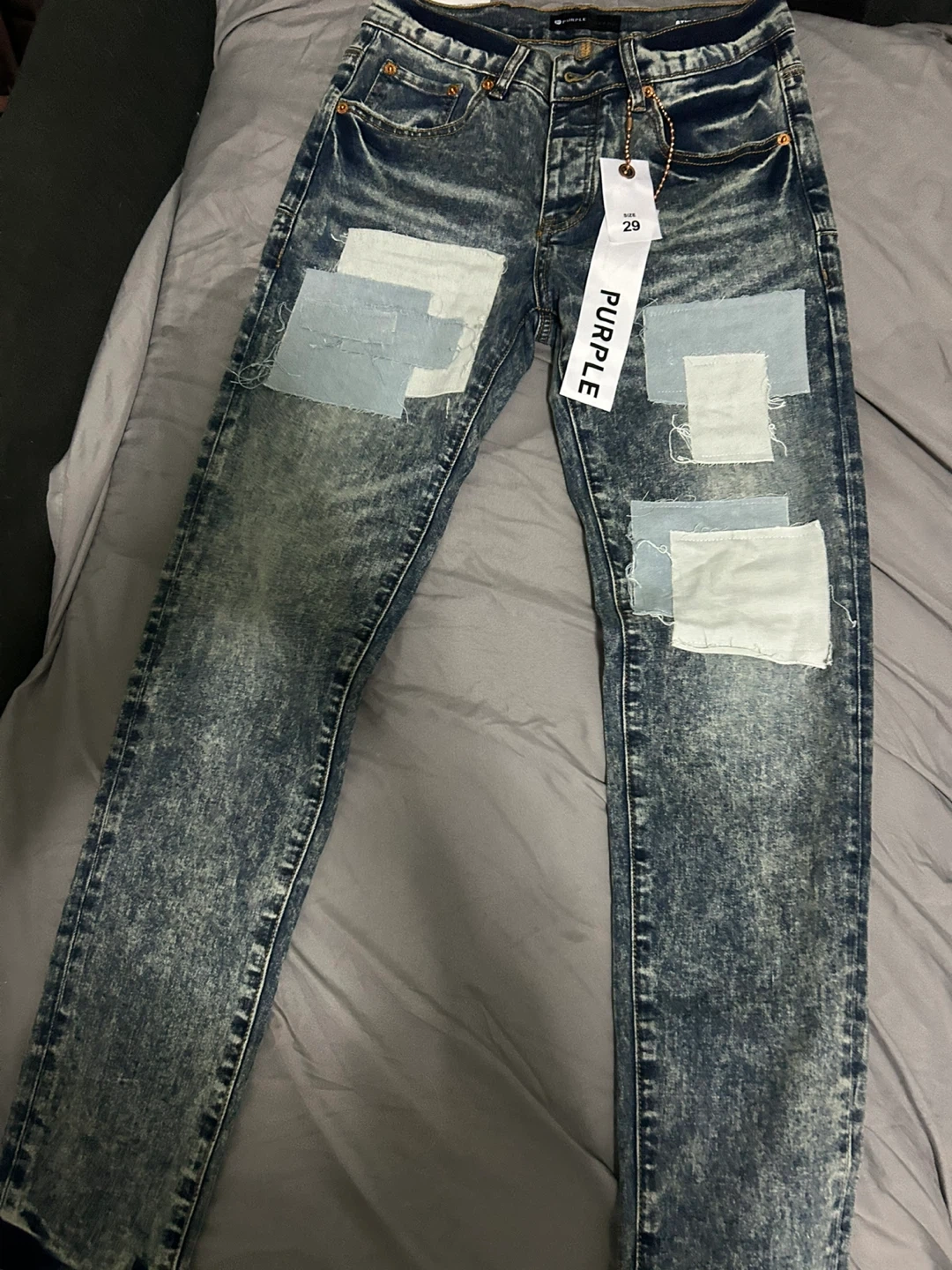 Purple Brand dropped fit mid rise jeans in size 29. Features a blue acid wash with patchwork details. Includes hidden black pocket rivets and reinforced belt loops.