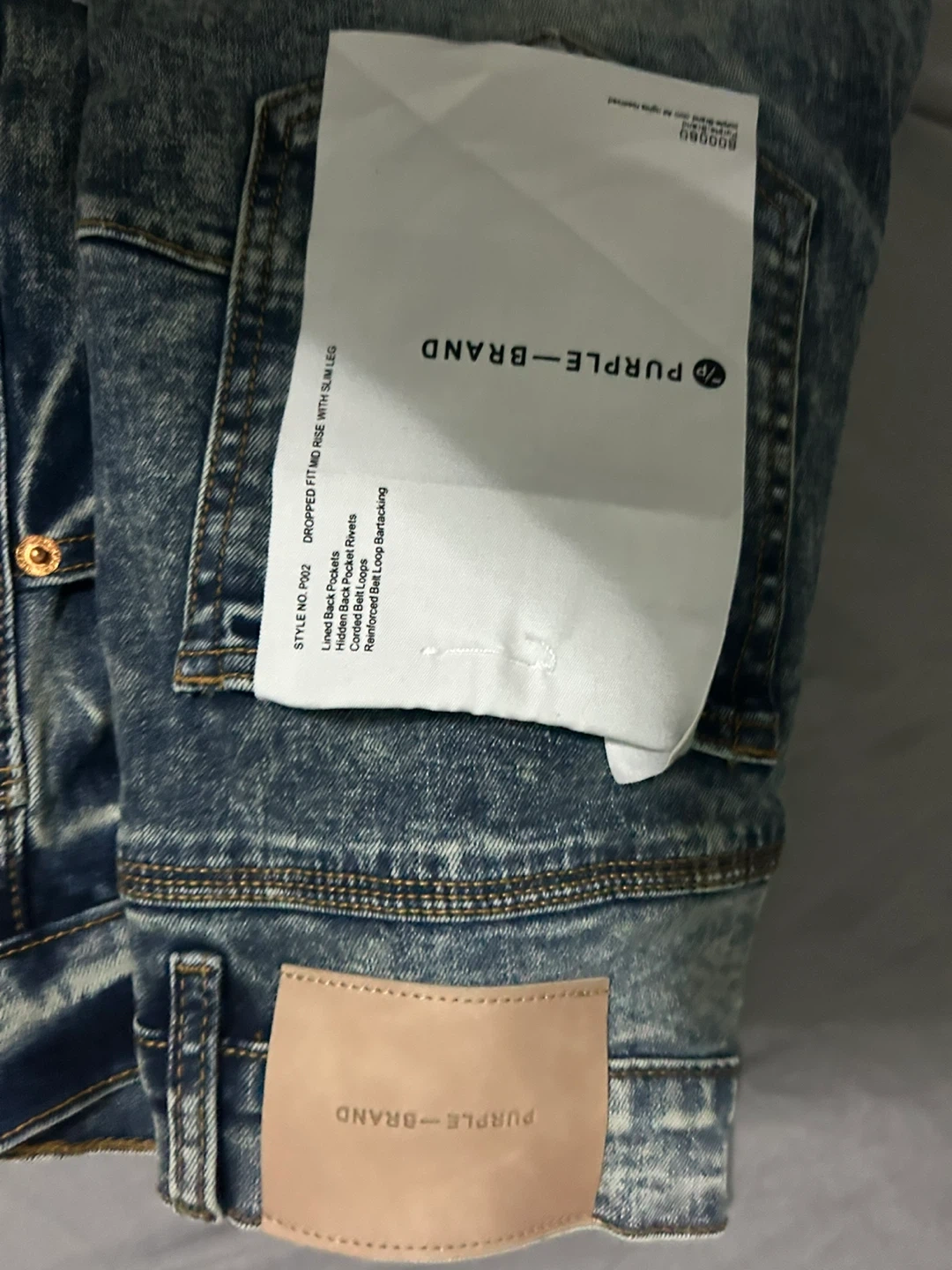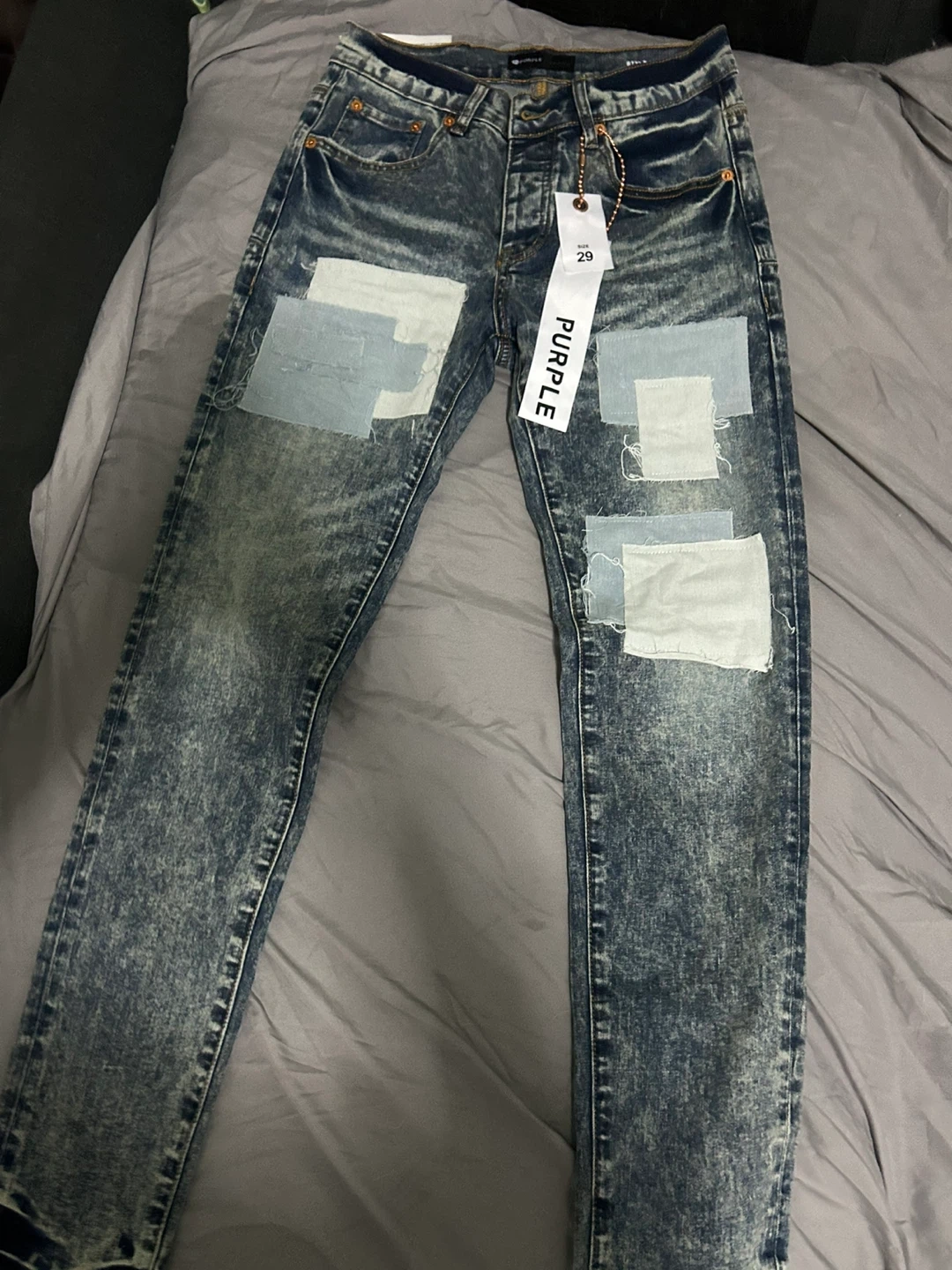 Purple Brand dropped fit mid rise jeans in size 29. Features a blue acid wash with patchwork details. Includes hidden black pocket rivets and reinforced belt loops.