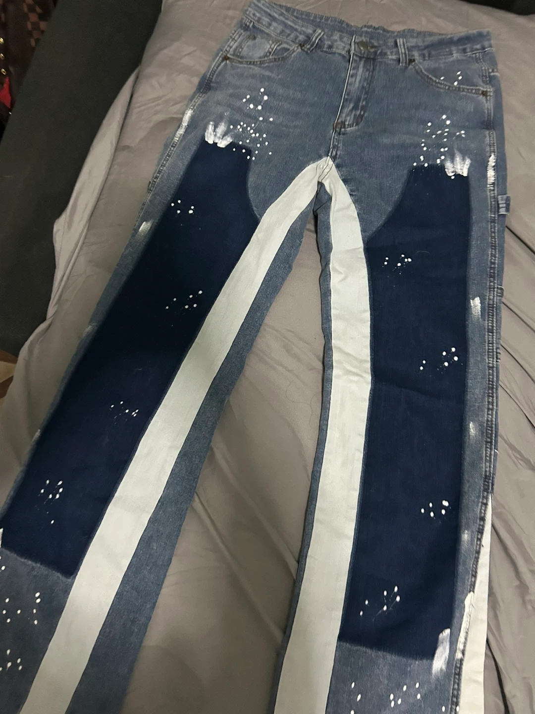 These blue denim jeans feature unique white paint splatter detailing throughout. They have dark blue and white stripe paneling down the legs. The pants are made from durable denim material.