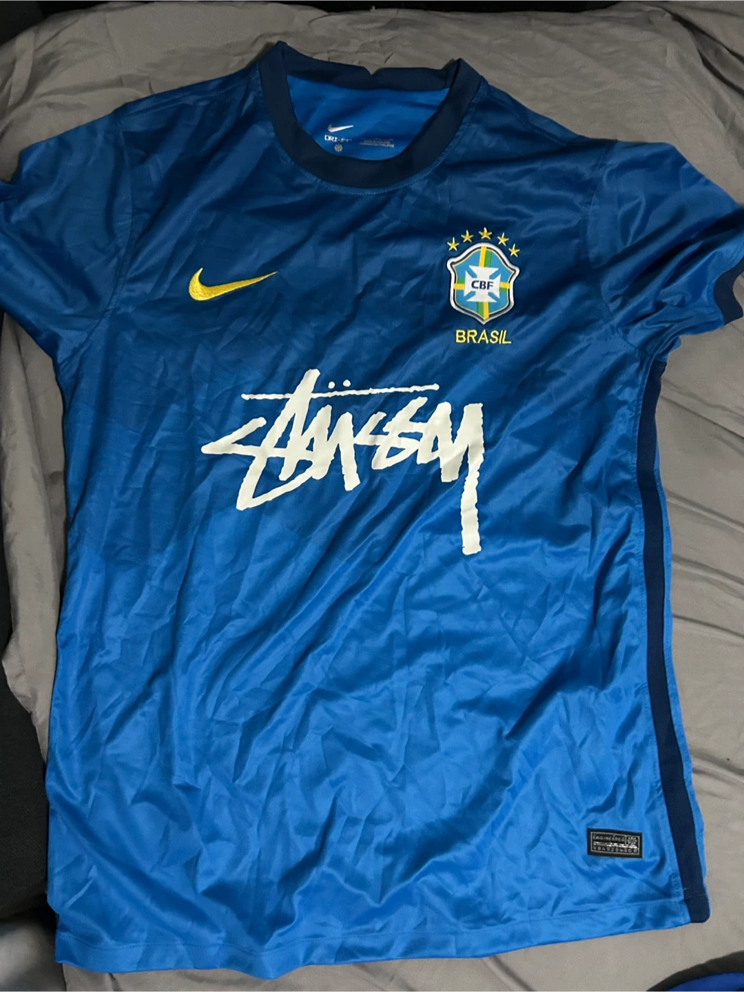 This Nike Dri-Fit soccer jersey features a Stussy graphic and the Brazil CBF crest. Made in Thailand. Short sleeves.