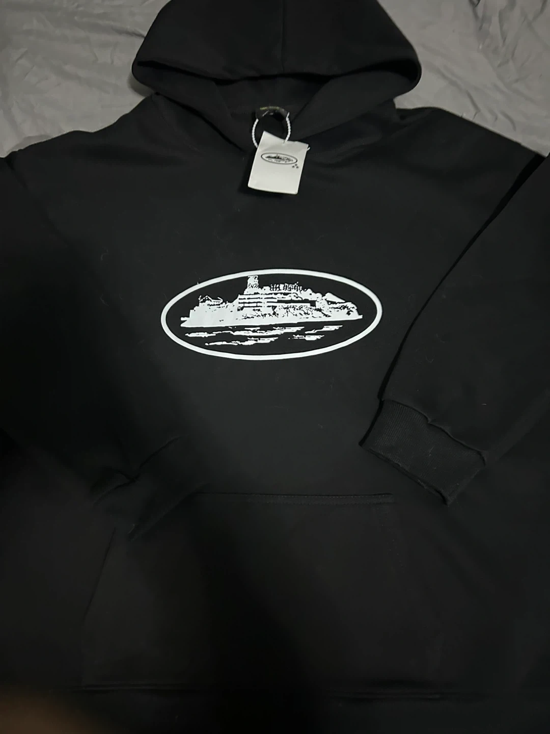 Black hooded sweatshirt with a white oval graphic on the chest. Includes original tags. Cotton blend material.