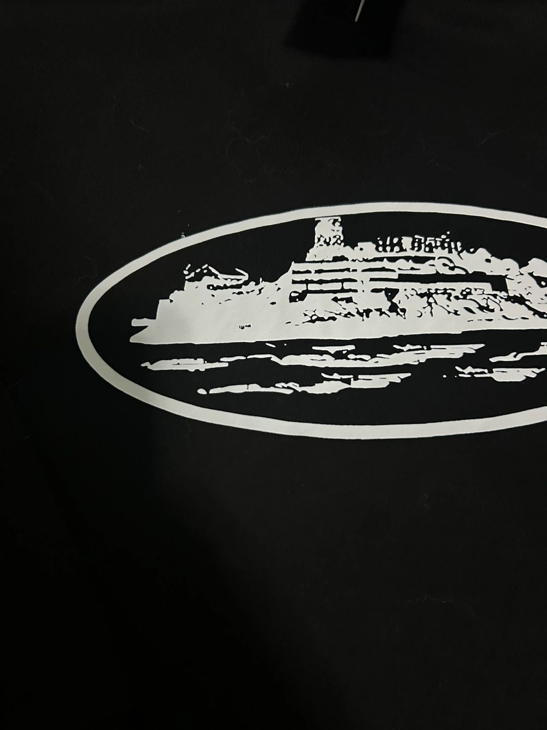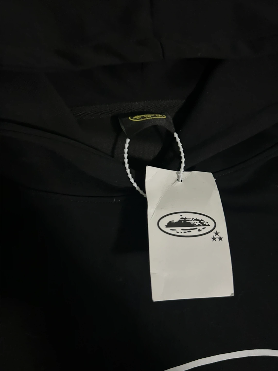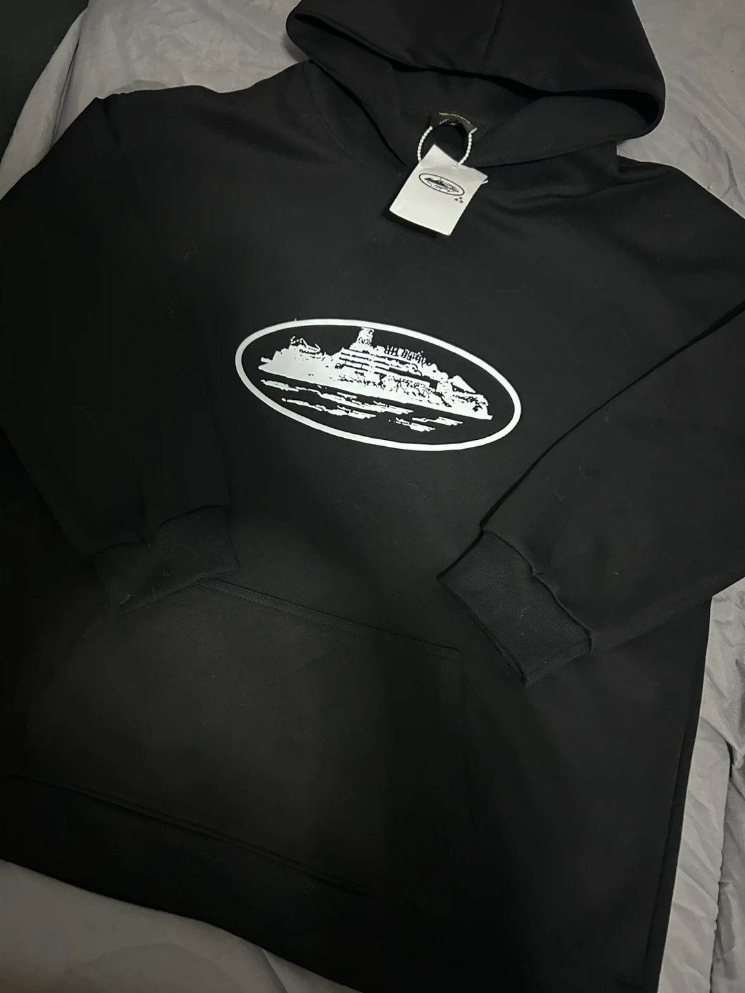 Black hooded sweatshirt with a white oval graphic on the chest. Includes original tags. Cotton blend material.