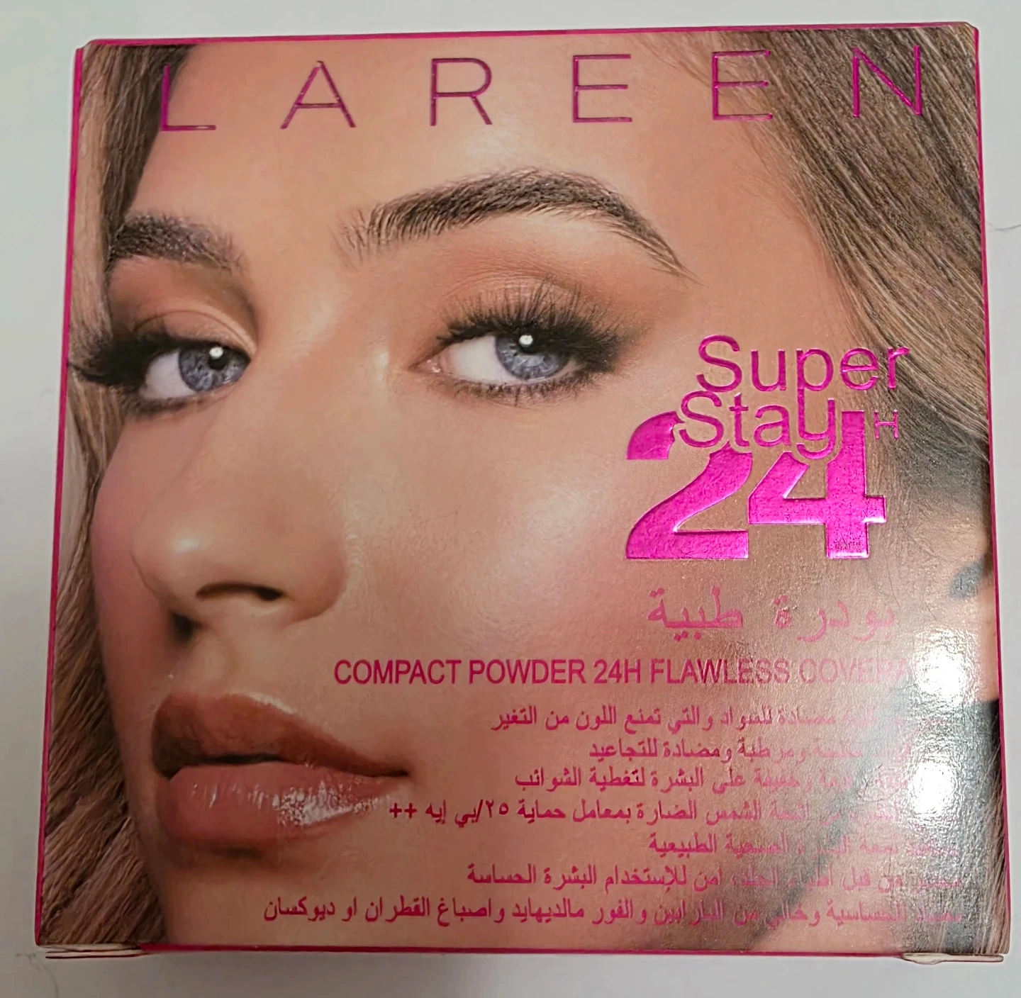 LAREEN Super Stay 24H Compact Powder provides flawless coverage. It's anti-shine and hydrating, with SPF 25 PA++ protection. This powder is suitable for sensitive skin and free from parabens and formaldehyde.