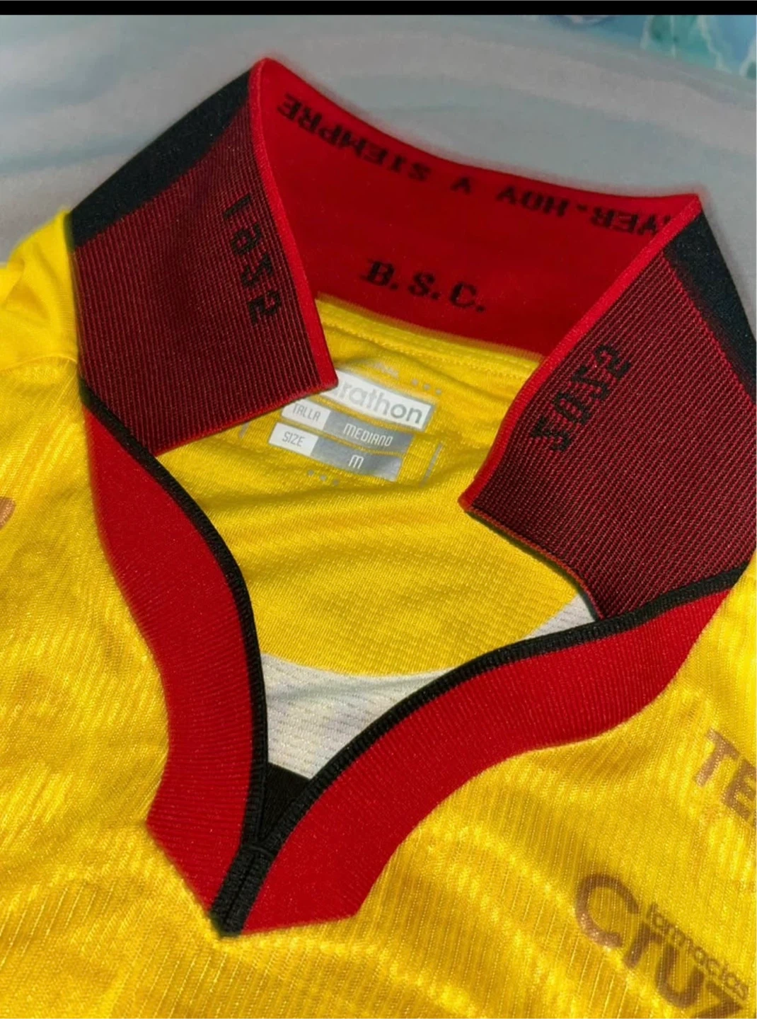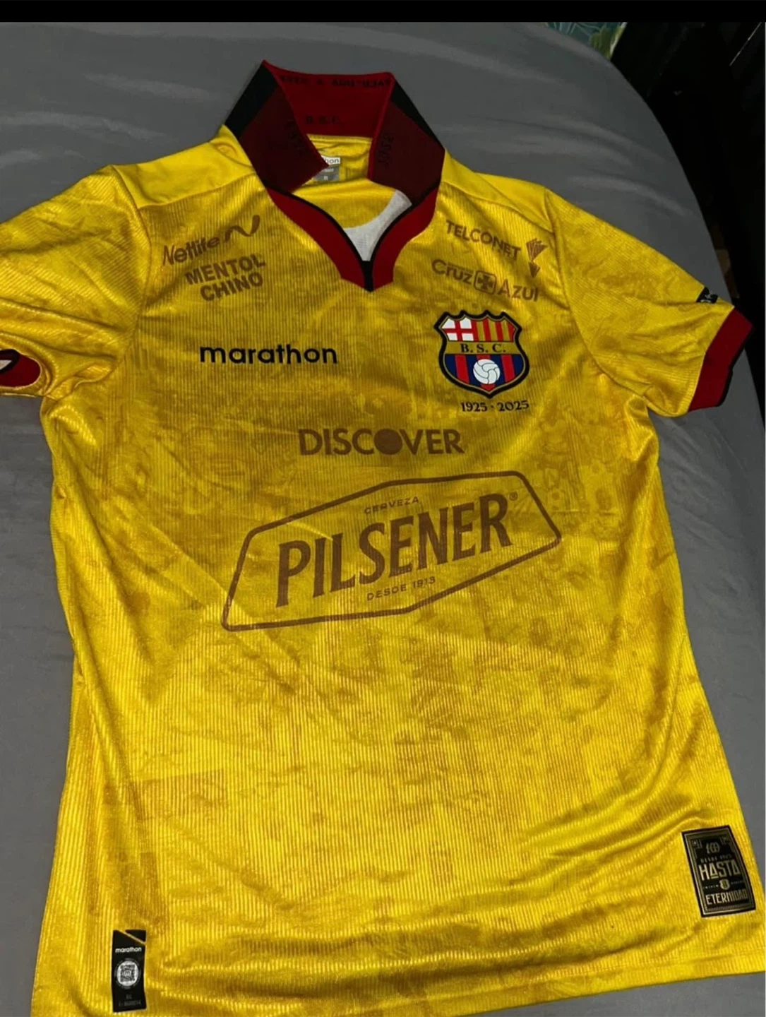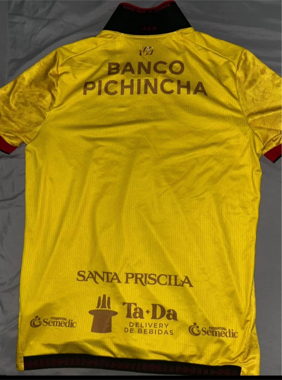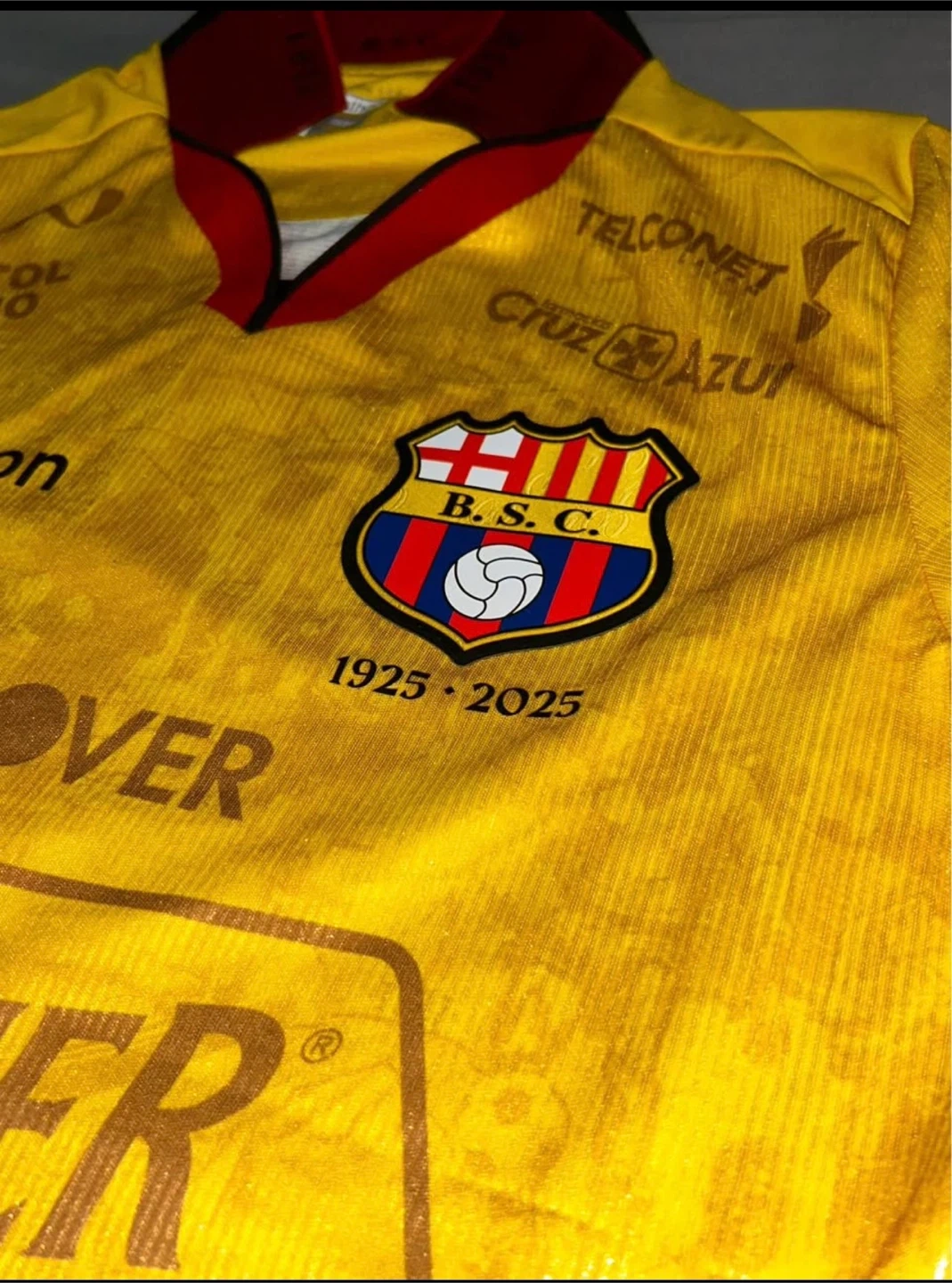 This is a yellow Barcelona Sporting Club soccer jersey. It's a size medium. The jersey features various sponsor logos printed on it.