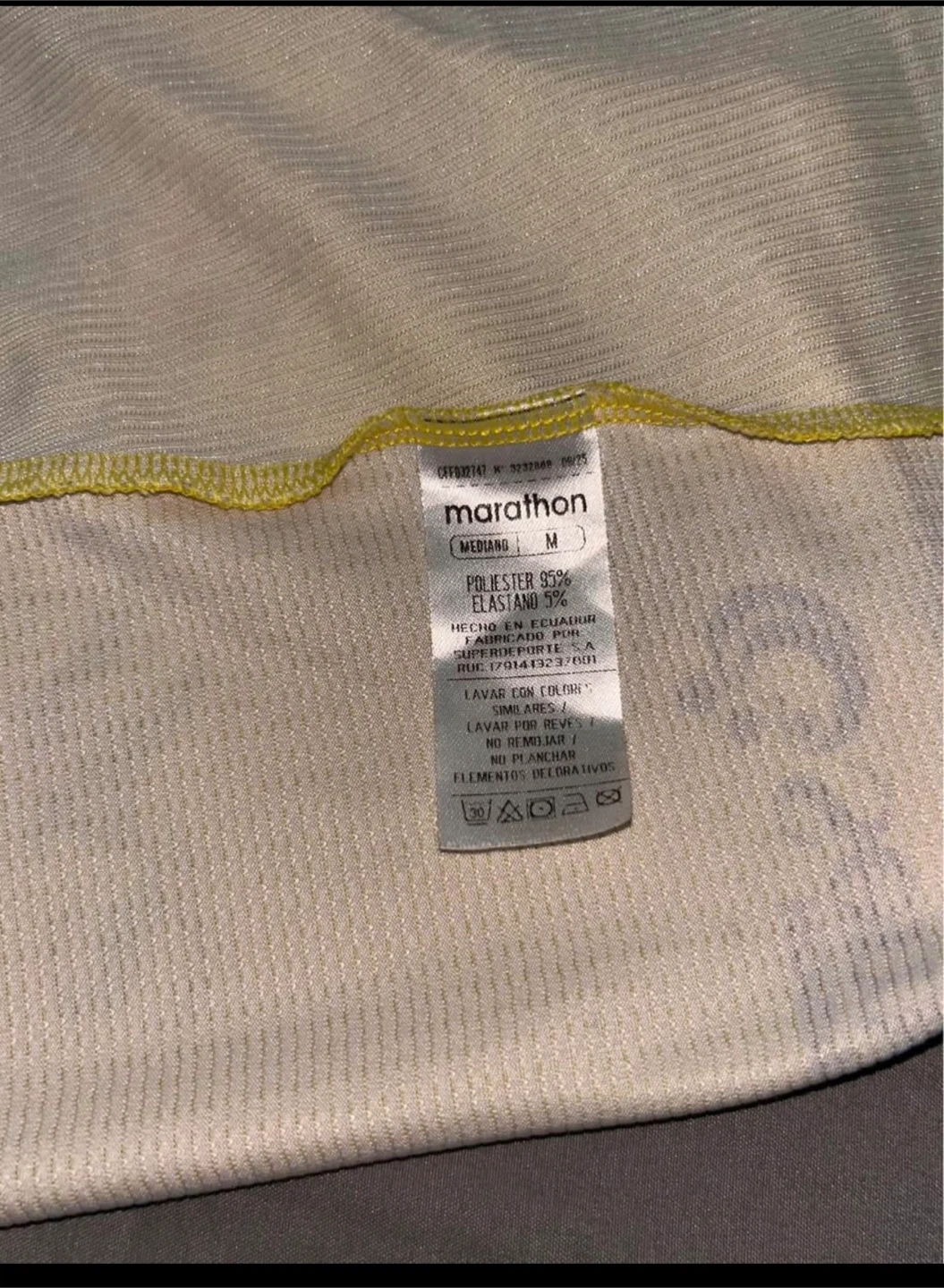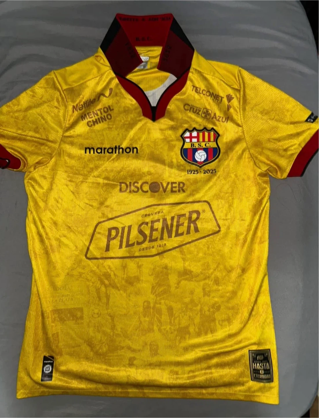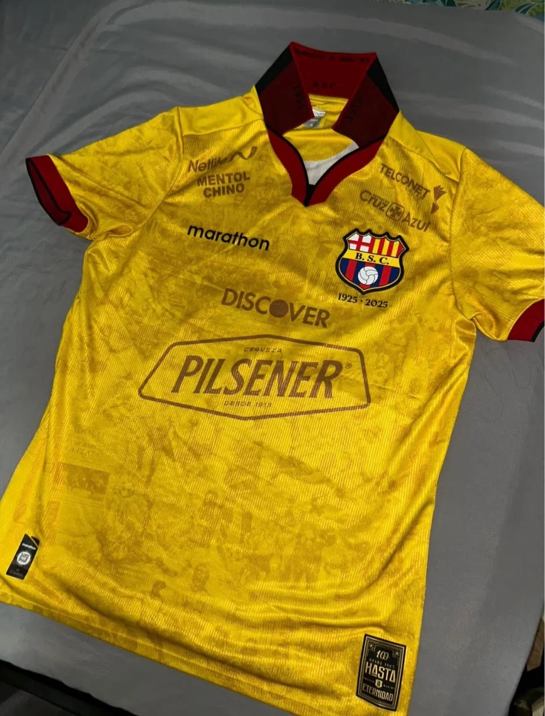 This is a yellow Barcelona Sporting Club soccer jersey. It's a size medium. The jersey features various sponsor logos printed on it.