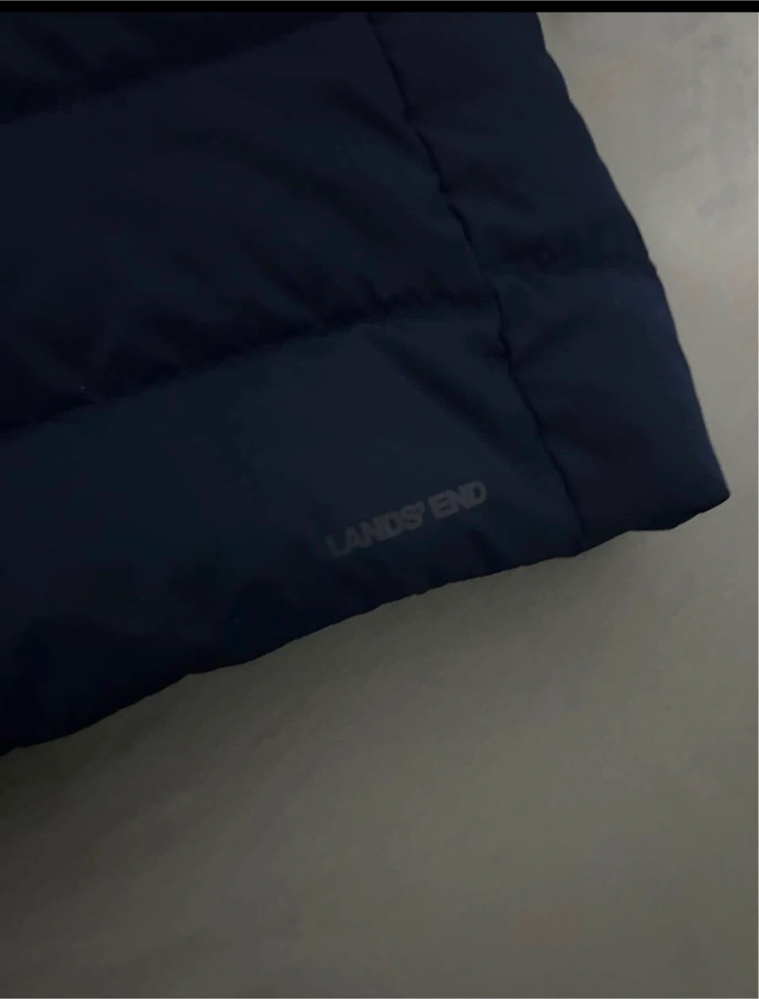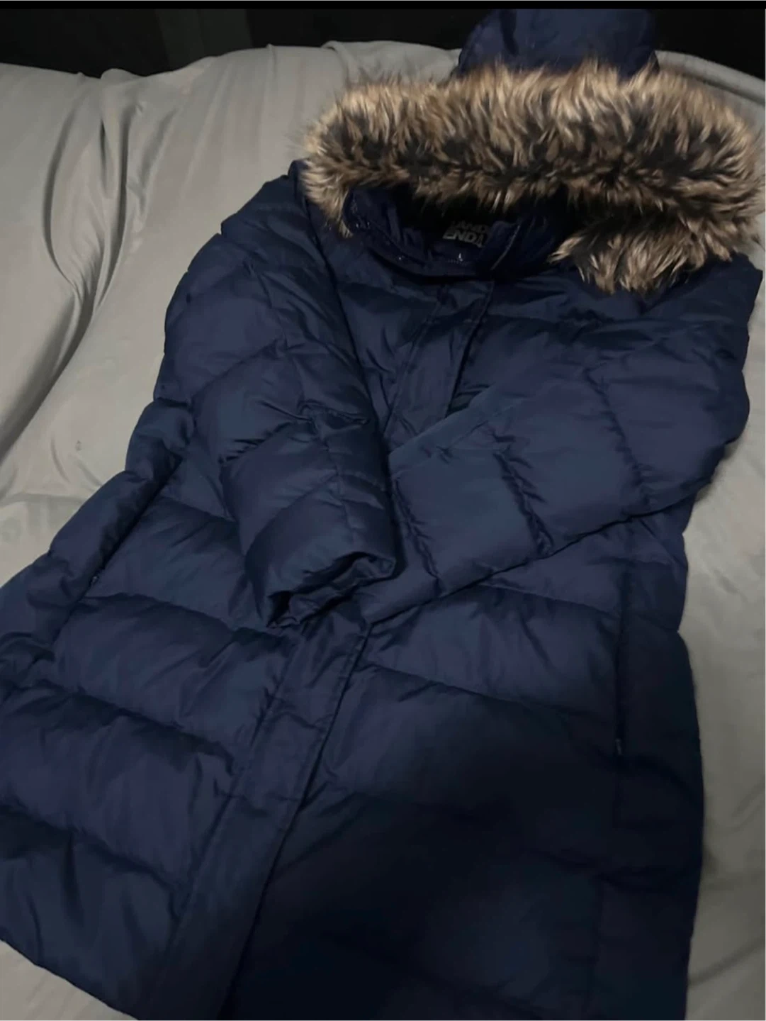 This Lands' End puffer coat is a stylish and warm navy blue. It features a cozy faux fur-trimmed hood. The coat's length and puffer design offer excellent cold-weather protection.