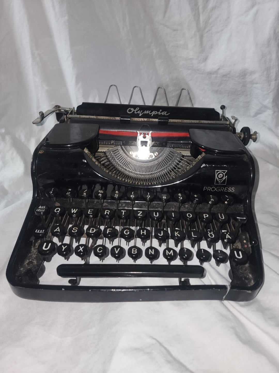 This is a vintage Olympia PROGRESS typewriter. It's a mechanical device made of metal. This machine would be useful for anyone interested in antique office equipment. Serial #312141. With the exception of the cracked front housing just below the space bar and a few scratches it's in excellent condition. Circa 1940 Germany. Very rare. Selling as is.