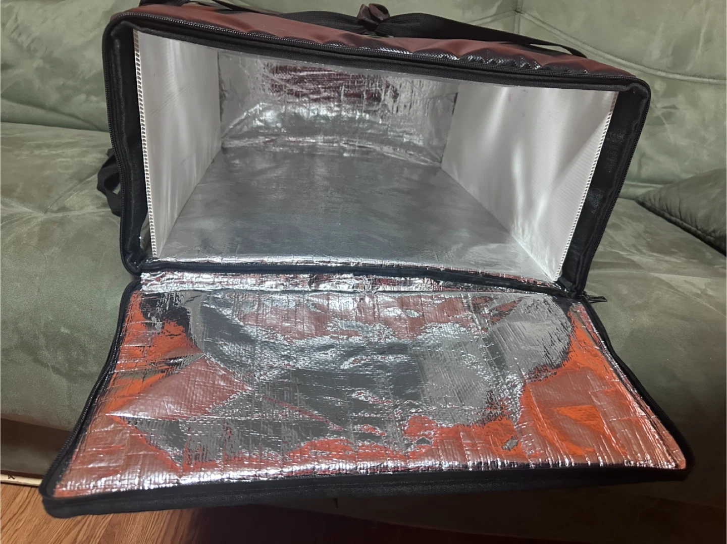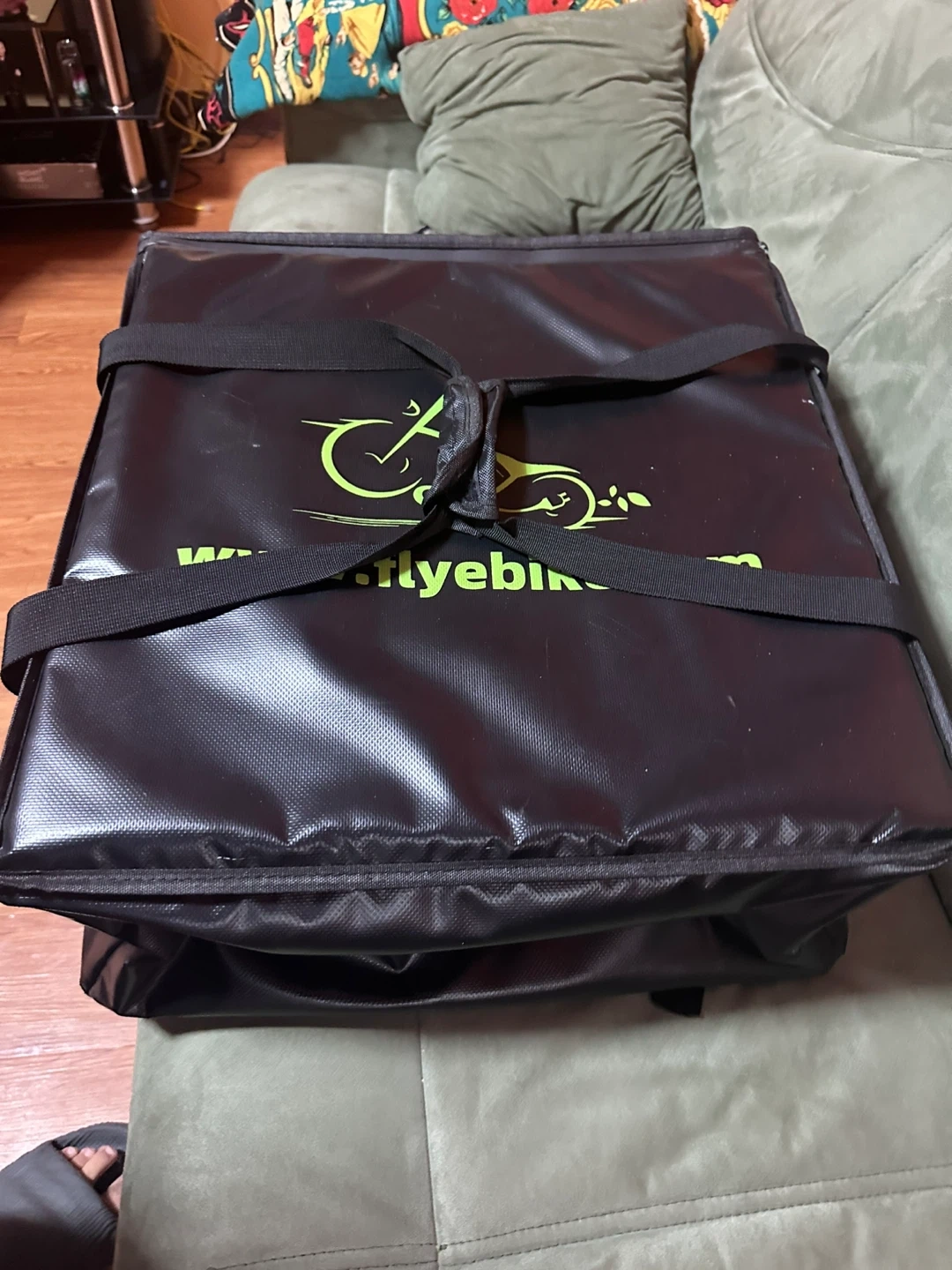 This is an insulated delivery bag by Flybike. It's designed for keeping food or other items at a consistent temperature. The interior is lined with reflective material for insulation and features straps for securing contents.