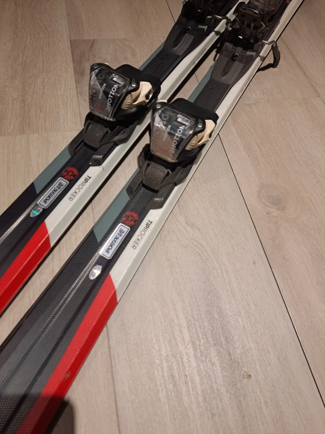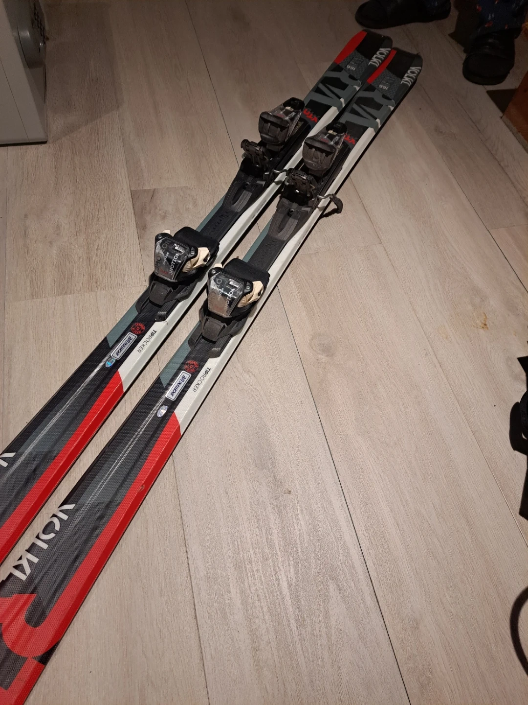 These are Volkl skis. They're 166 cm long and feature a composite core. Progressive technology is used for better performance.