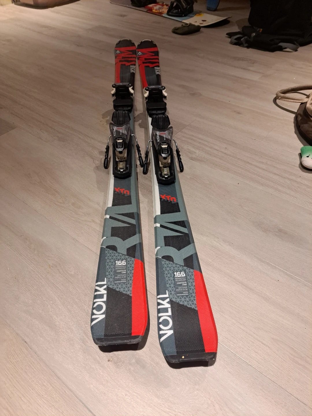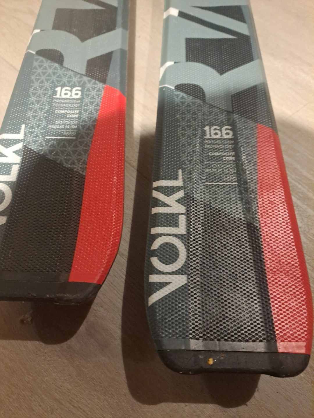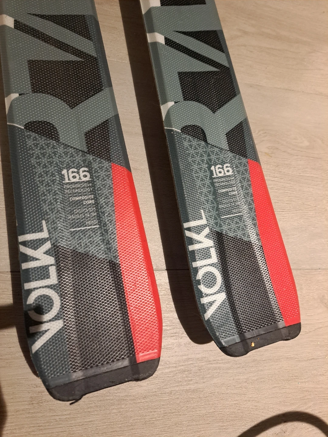 These are Volkl skis. They're 166 cm long and feature a composite core. Progressive technology is used for better performance.