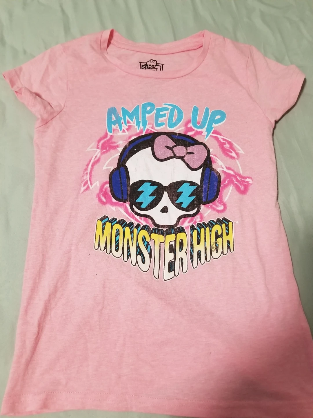 This is a pink Monster High t-shirt with a "Amped Up" graphic featuring a skull wearing headphones and sunglasses. It's made of 60% cotton and 40% polyester. The size is S/P (7/8).