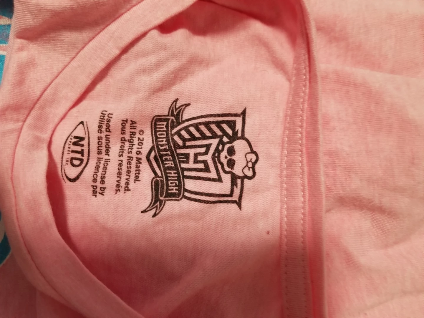 This is a pink Monster High t-shirt with a "Amped Up" graphic featuring a skull wearing headphones and sunglasses. It's made of 60% cotton and 40% polyester. The size is S/P (7/8).