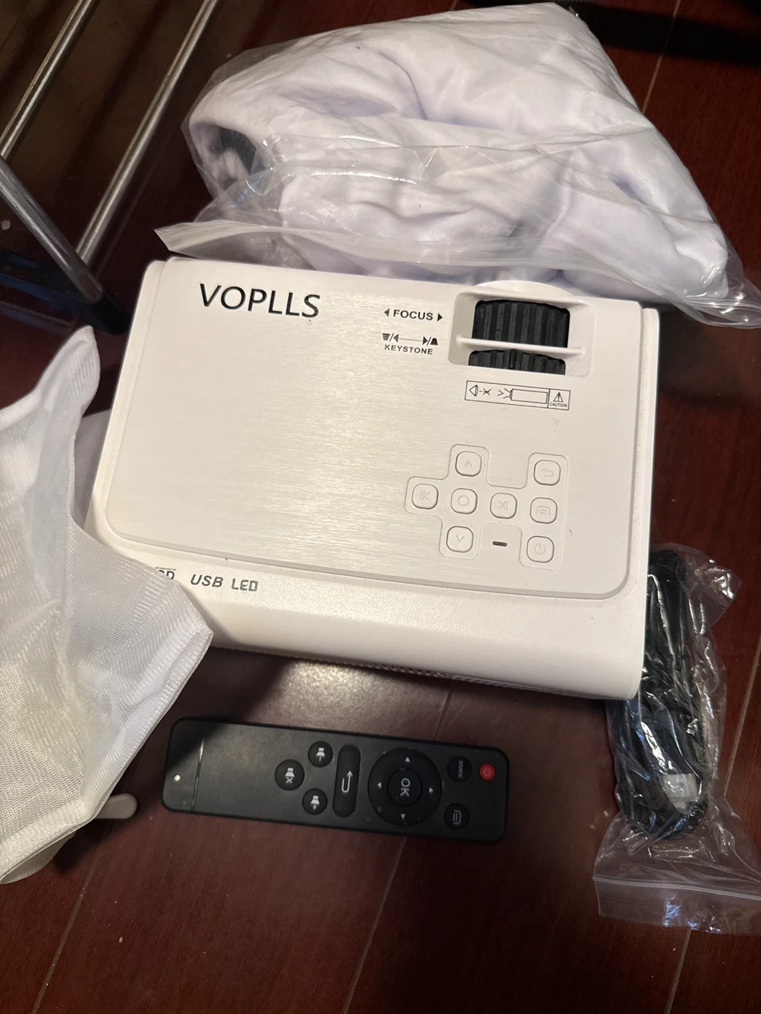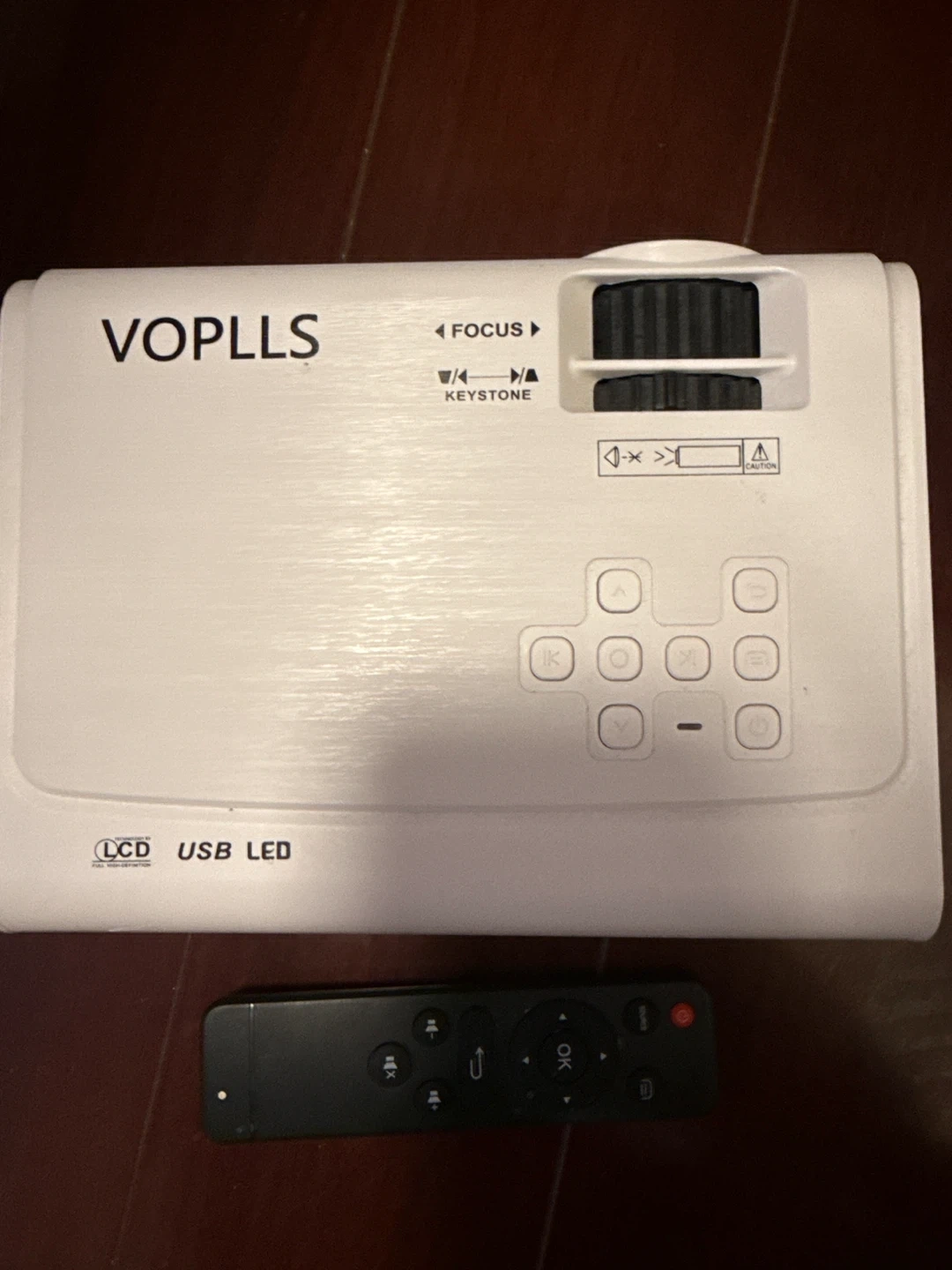 VOPLLS LCD USB LED projector with remote control included. It has focus and keystone adjustment dials. This projector is great for home entertainment!