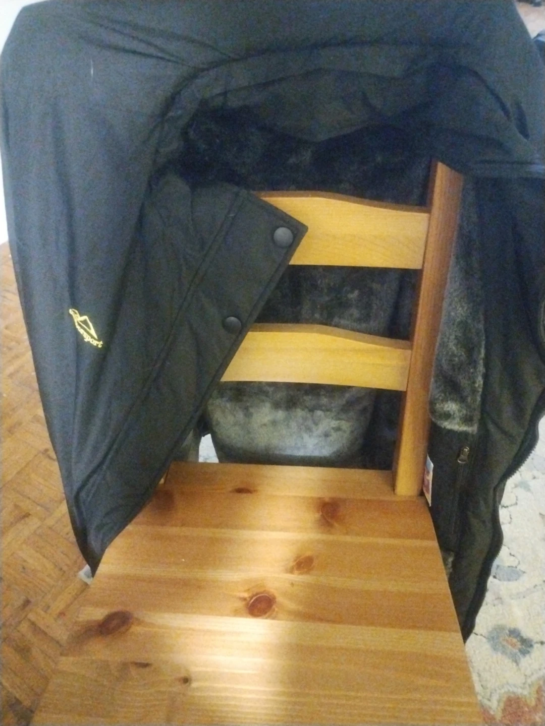 Black winter jacket with a soft faux fur lining for warmth. It features a snap closure and a zipper for secure fastening. This jacket is great for staying cozy during colder months!