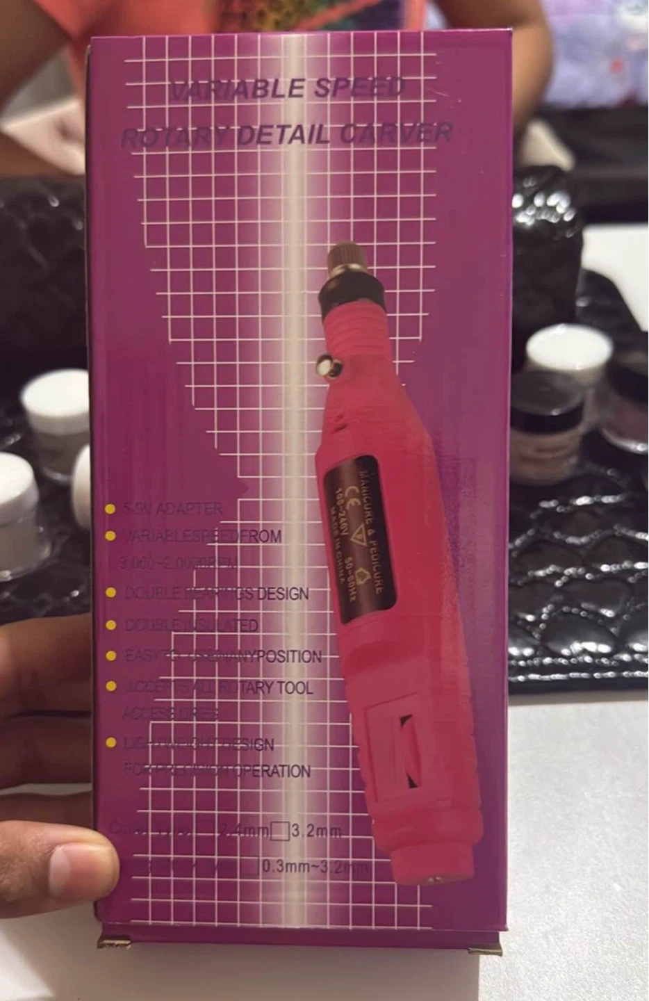 This is a pink rotary detail carver, also known as a nail machine. It features variable speed control and comes with various bits for different uses. It's USB powered and suitable for personal nail care.