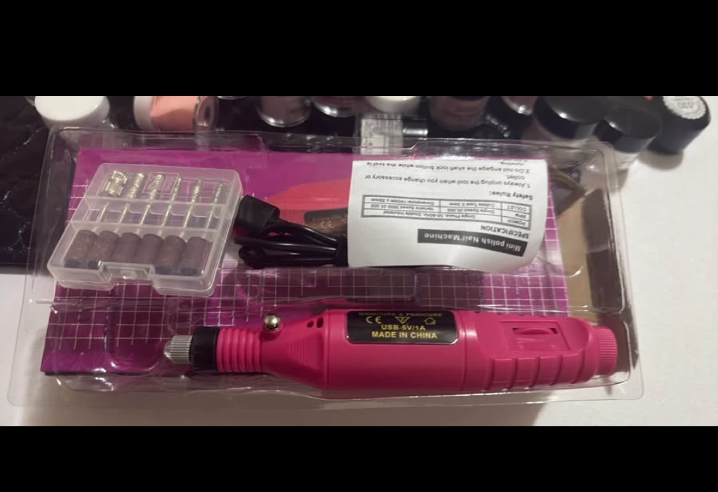 This is a pink rotary detail carver, also known as a nail machine. It features variable speed control and comes with various bits for different uses. It's USB powered and suitable for personal nail care.