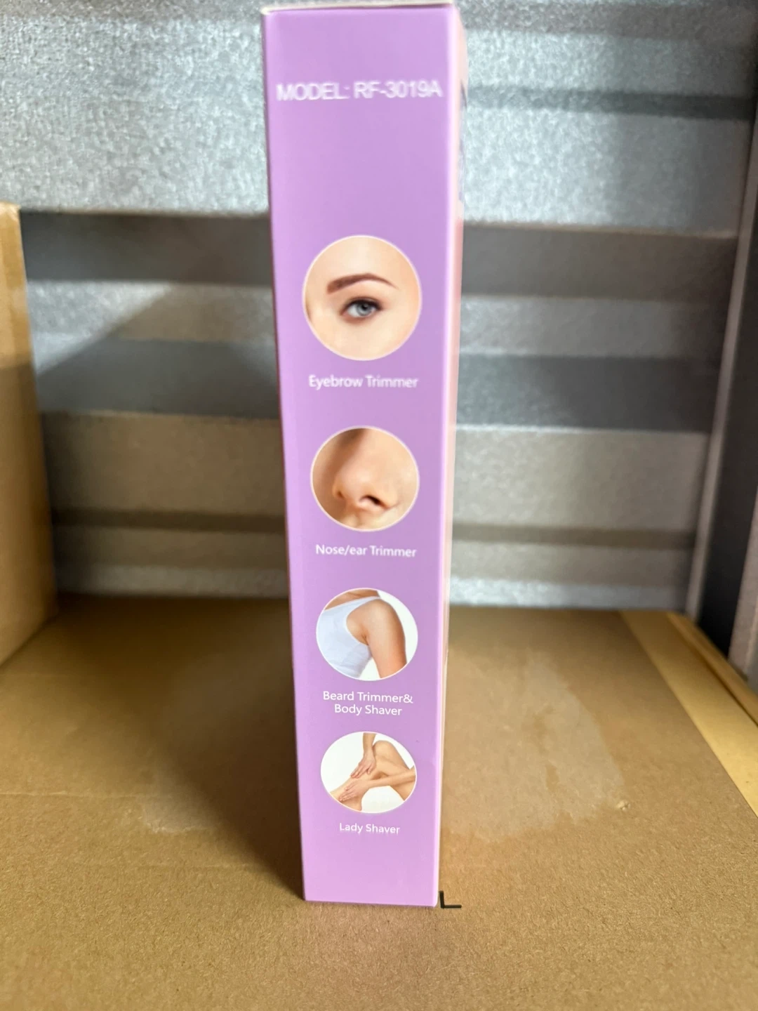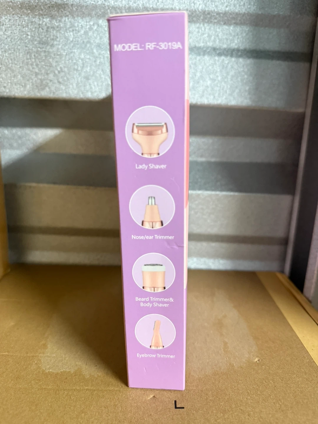 This is a 4-in-1 rechargeable grooming kit. It includes a lady shaver, eyebrow trimmer, nose/ear trimmer, and beard trimmer/body shaver. The kit comes with USB charging and offers 90 minutes of operating time on a full charge. It's ideal for at-home grooming needs.