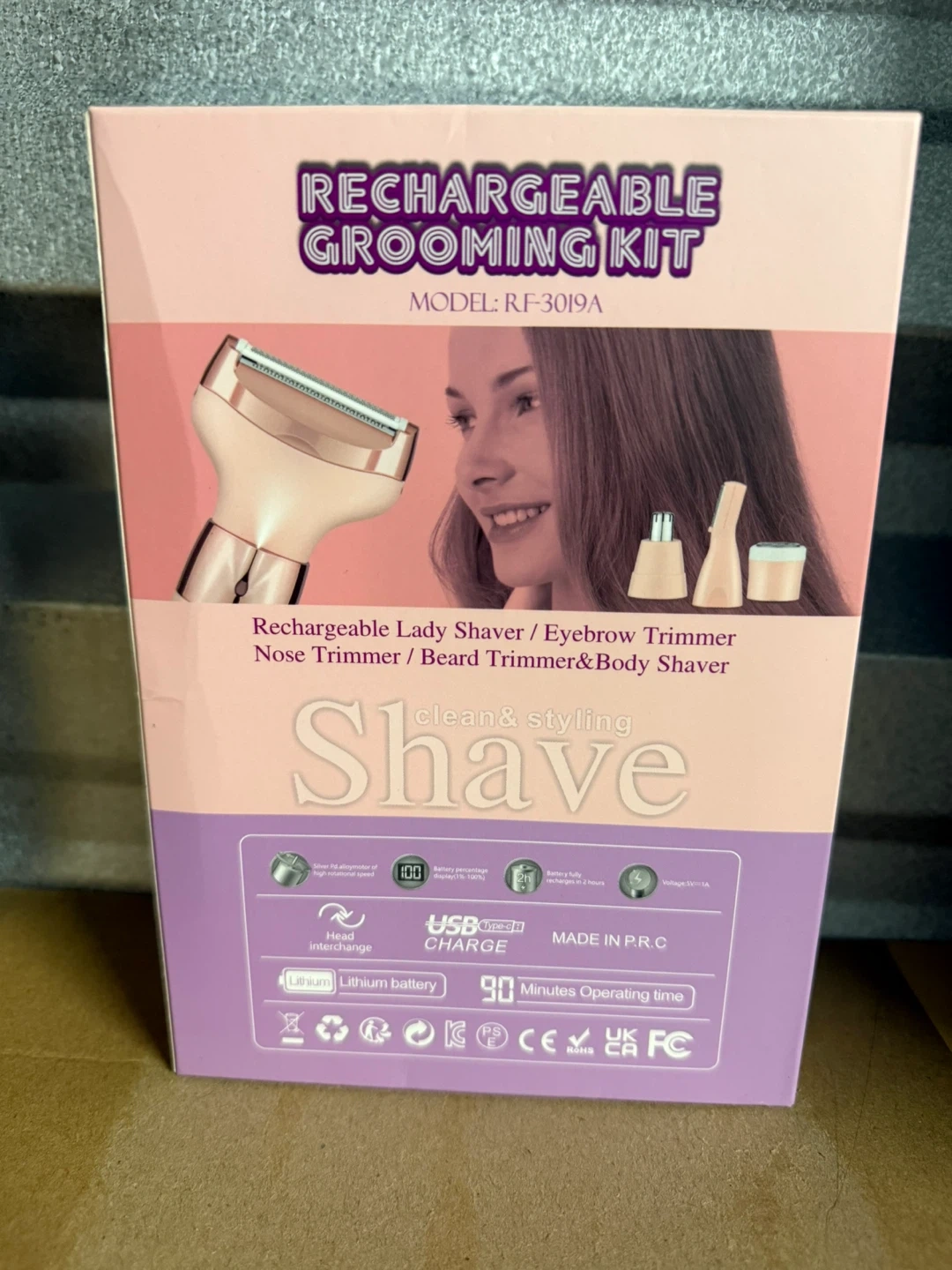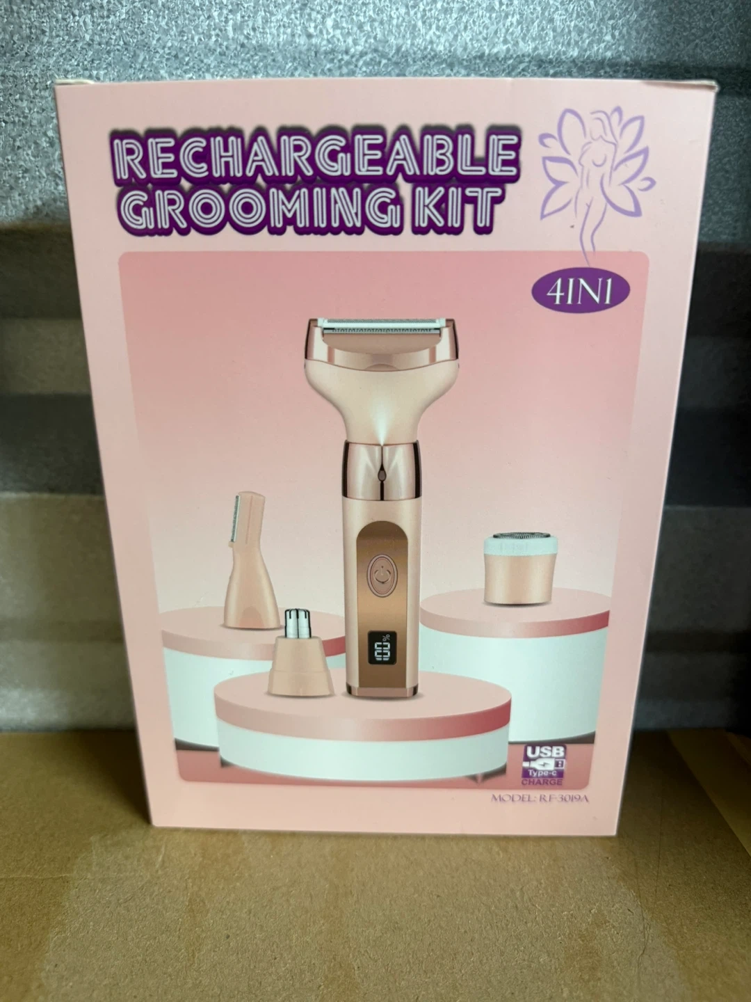 This is a 4-in-1 rechargeable grooming kit. It includes a lady shaver, eyebrow trimmer, nose/ear trimmer, and beard trimmer/body shaver. The kit comes with USB charging and offers 90 minutes of operating time on a full charge. It's ideal for at-home grooming needs.