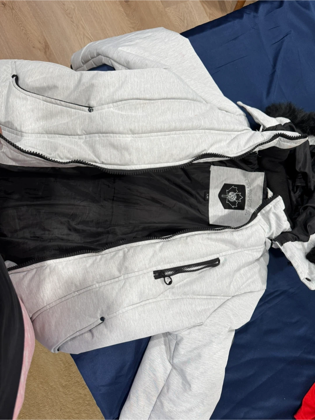 This light grey puffer jacket features a cosy fur-lined hood. It's designed with multiple zippered pockets for secure storage. The interior is lined with black fabric.