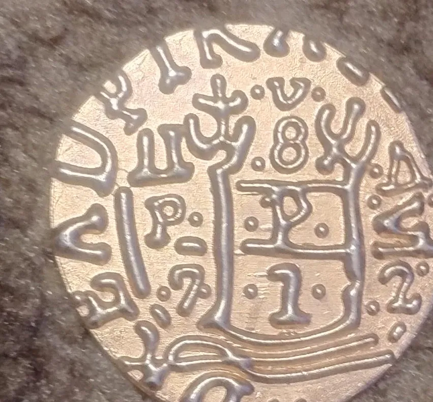 This is a vintage coin featuring intricate, unusual raised markings. The metallic finish gives it a unique appearance. It appears to be a decorative item or a collectible due to its distinct design elements.