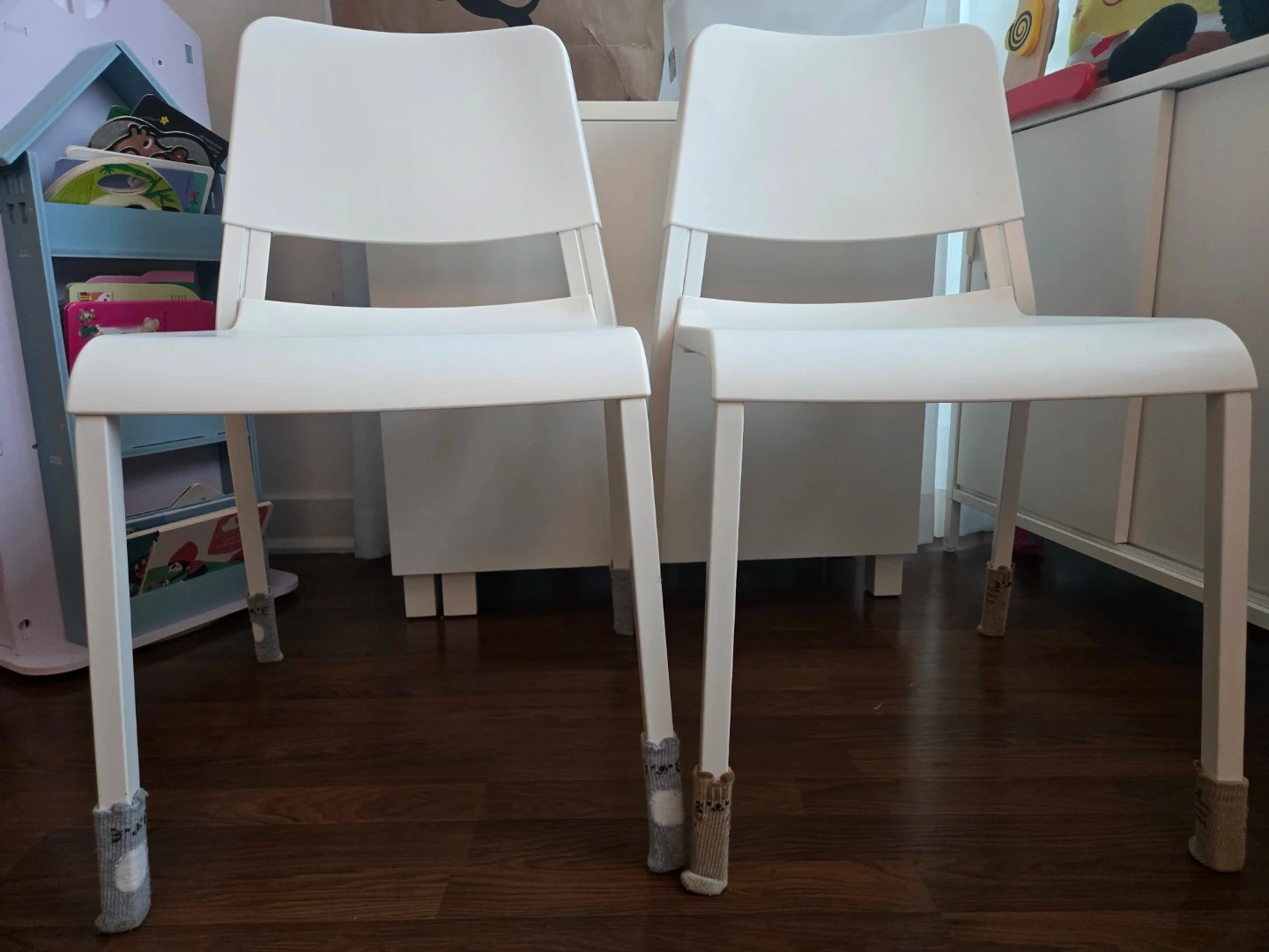 Two white dining chairs with metal legs. They're made of a durable plastic seat and back. Includes four cute animal-themed chair leg covers per chair