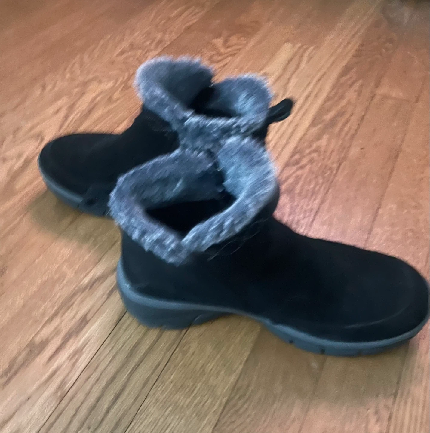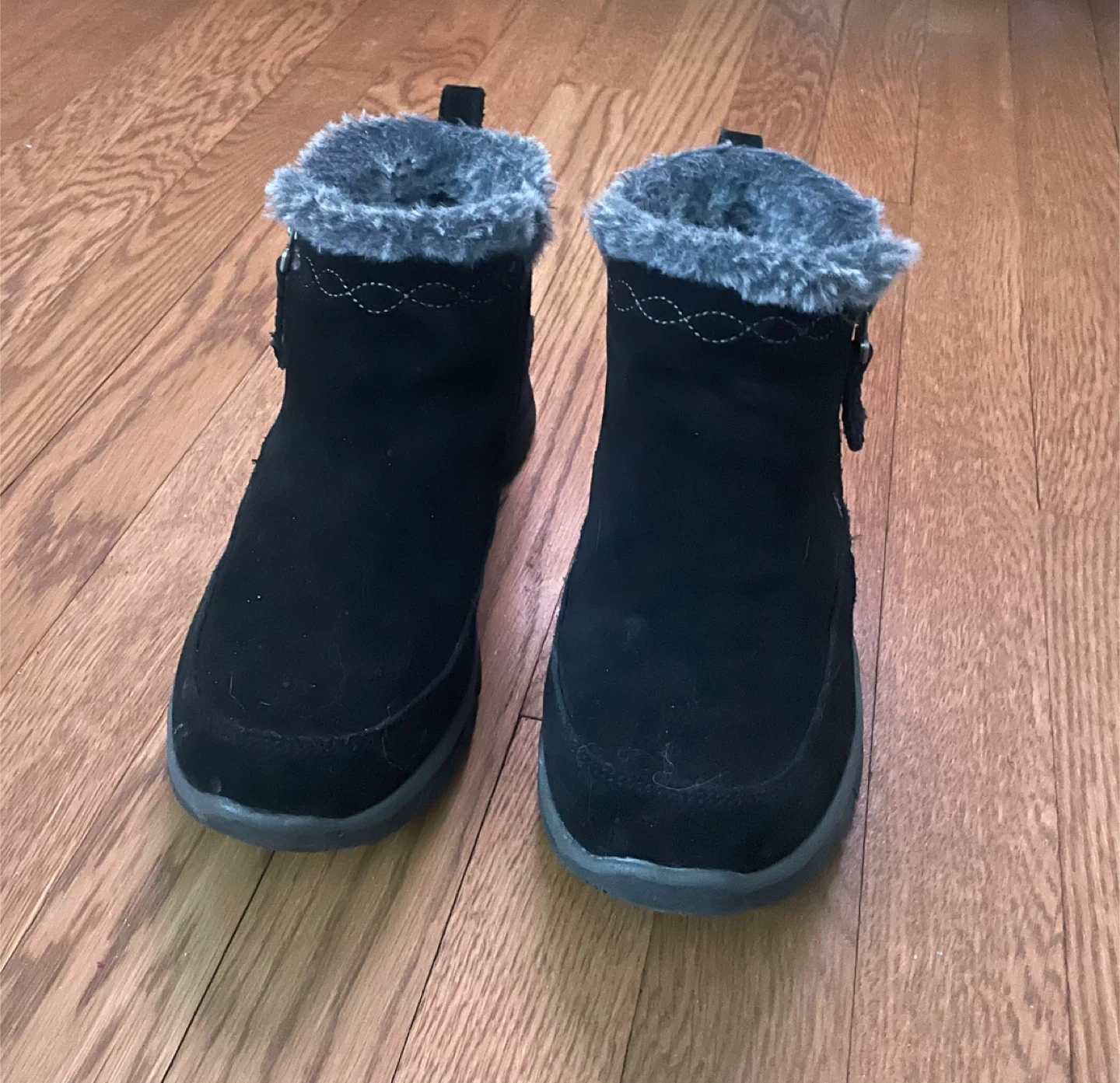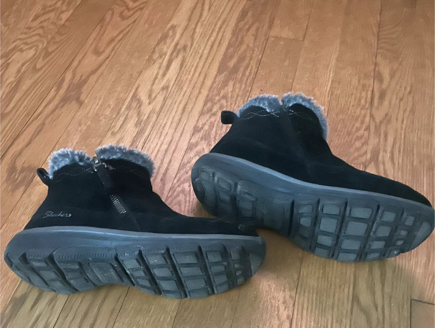 Cozy Skechers winter boots in black suede. They feature a soft faux fur lining for warmth and a side zipper for easy on and off. The durable soles provide good traction.