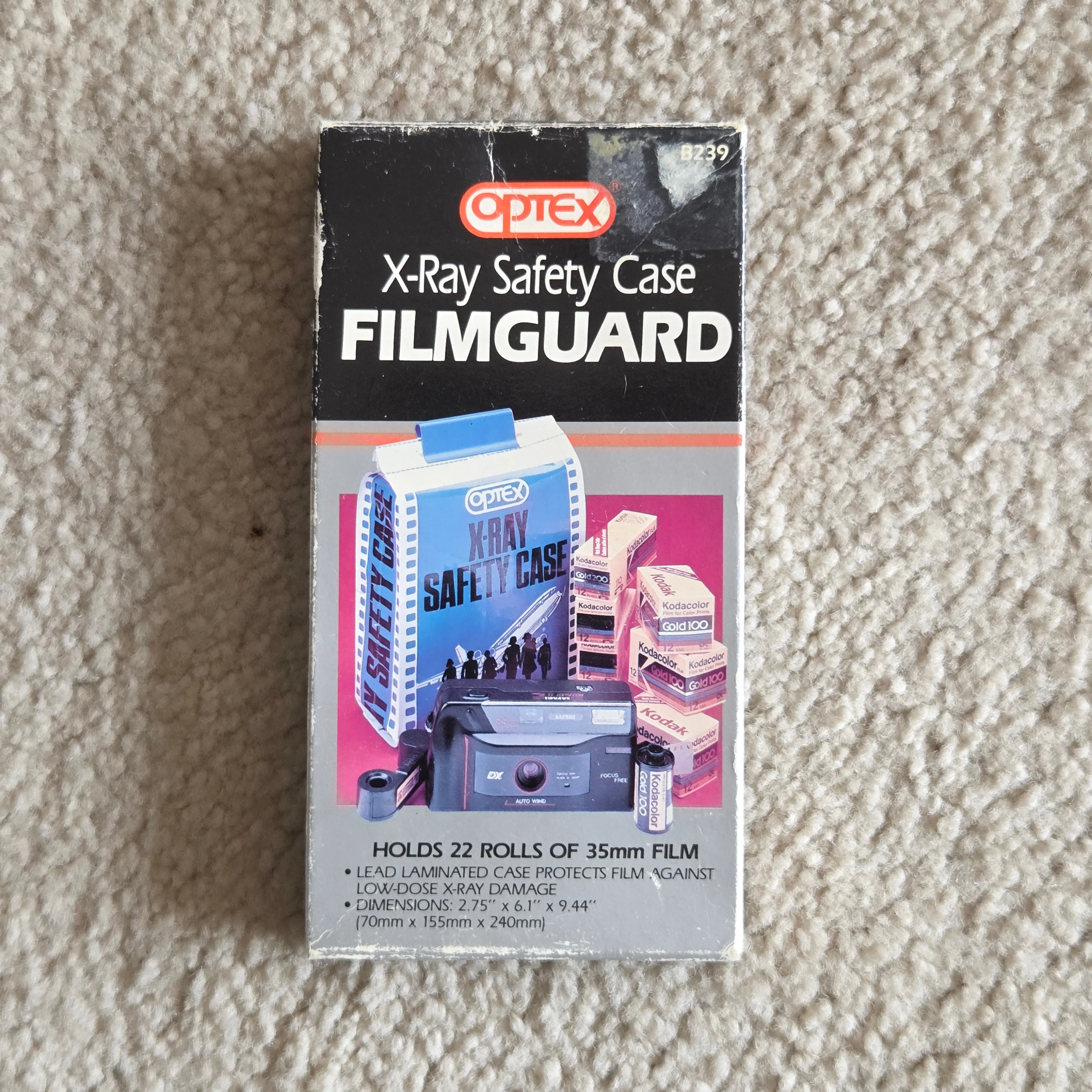 For sale: OPTEX X-Ray Safety Case 35mm Filmguard (B239). Protects 35mm film from X-ray scanners at airports or security checkpoints. This item is unused. Holds 22 rolls of 35mm film. Lead laminated case protects film against low-dose x-ray damage. Dimensions: 2.75" x 6.1" x 9.44" (70mm x 155mm x 240mm). For sale by owner. Cash or cashless payment accepted. Curbside pickup available.