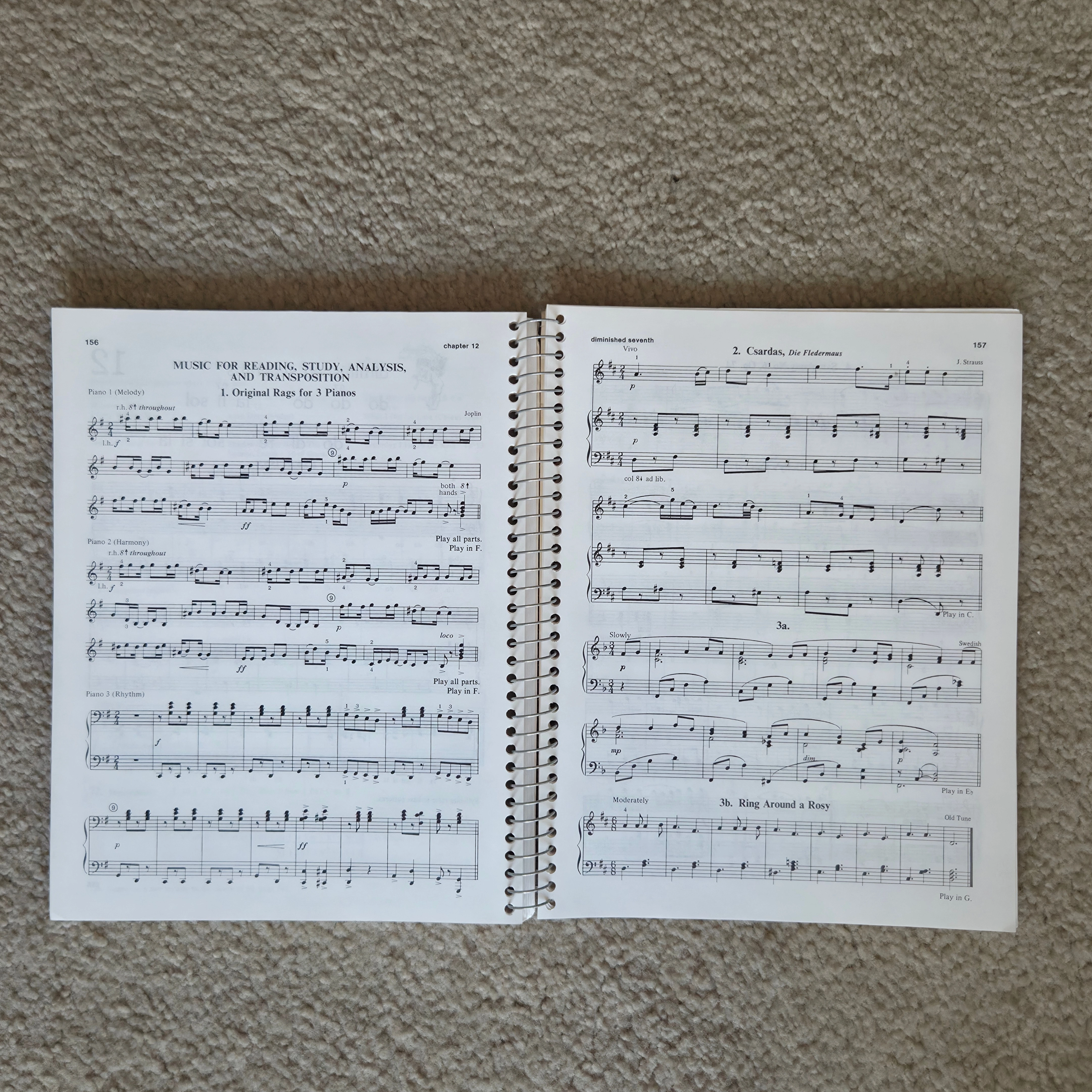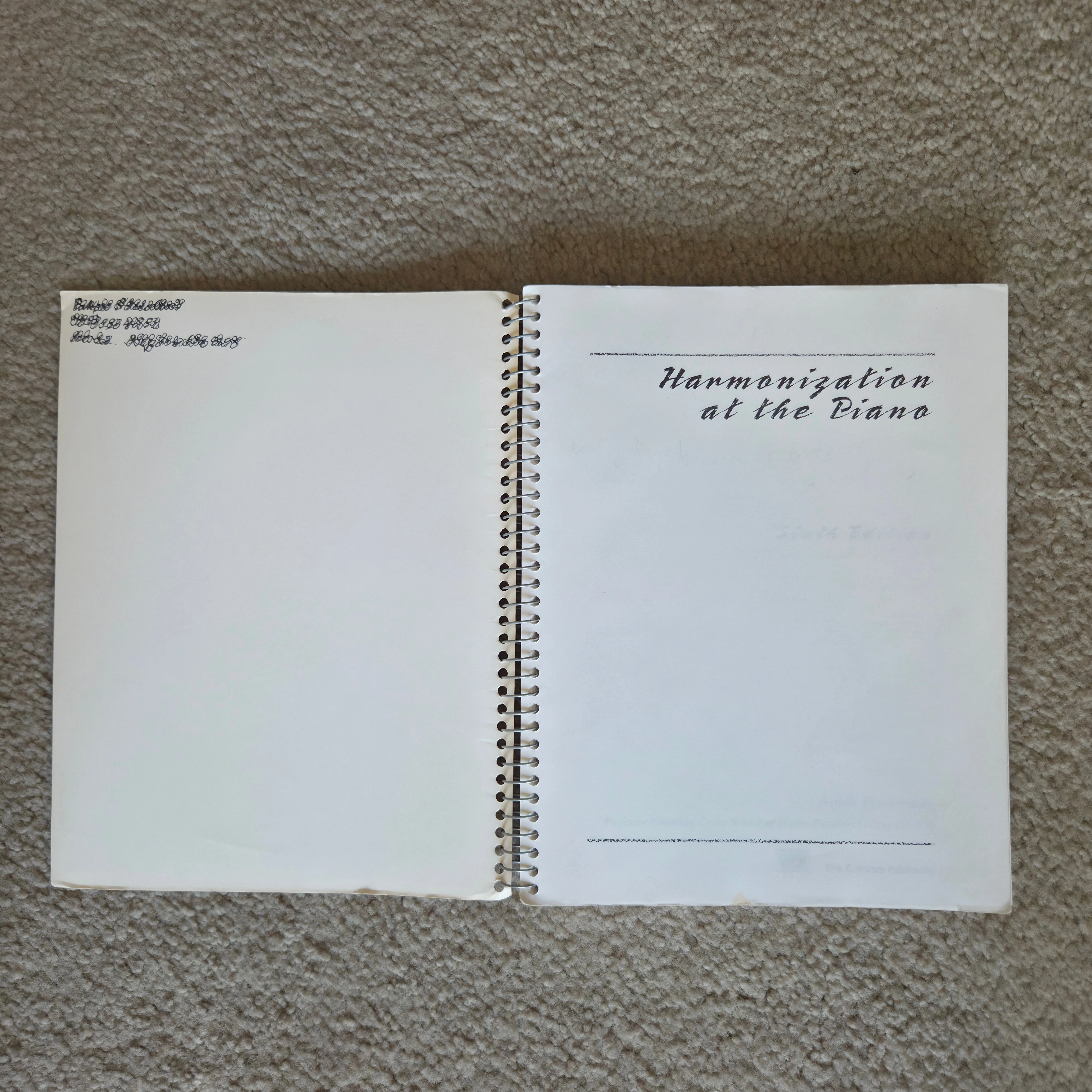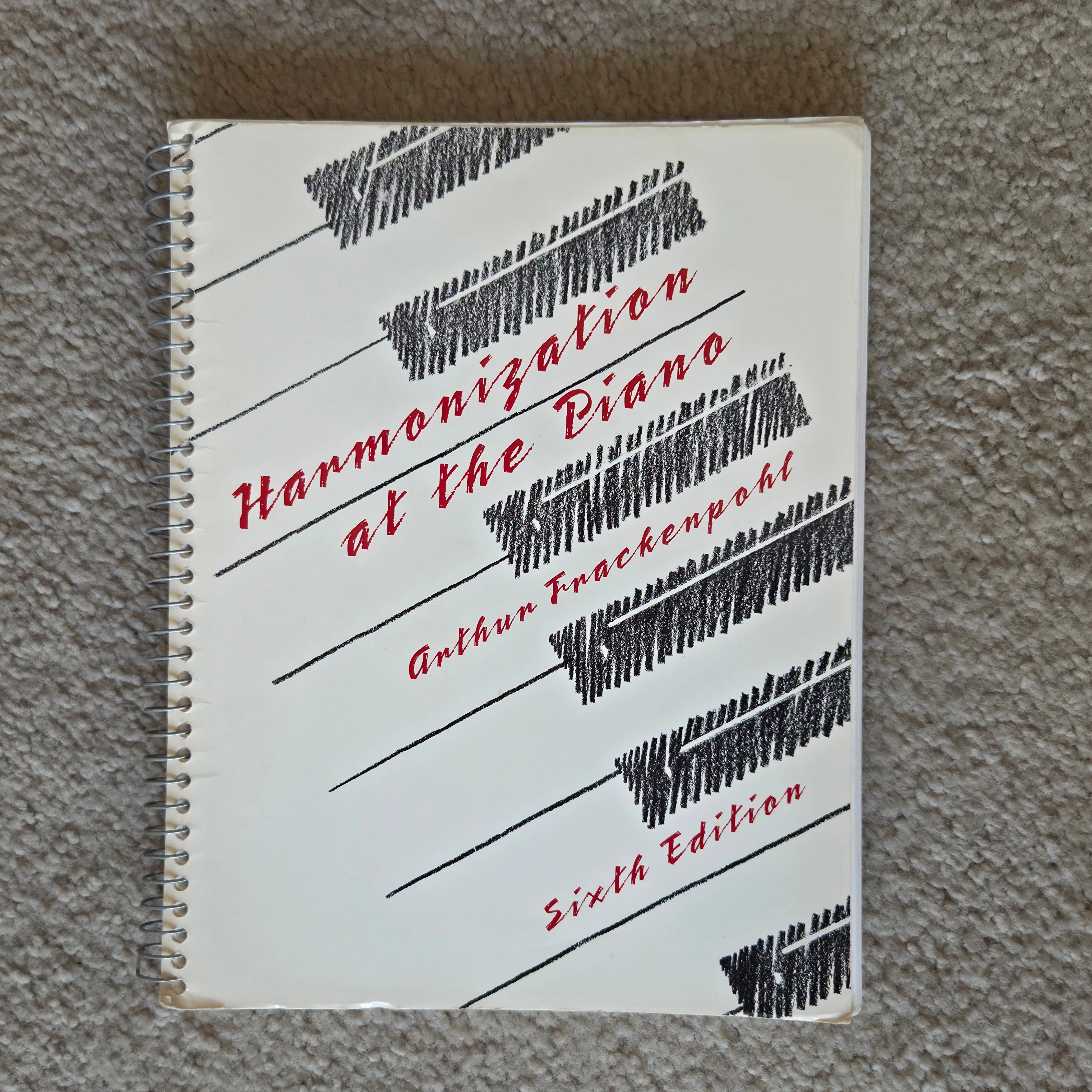 This is a copy of Harmonizing at the Piano by Arthur Frackenpohl - Sixth Edition. It's in great condition with no markings on the sheet music itself. There are a few lines of markings on the inside front and back cover, but otherwise, this songbook is pristine. Spiral-bound paperback.