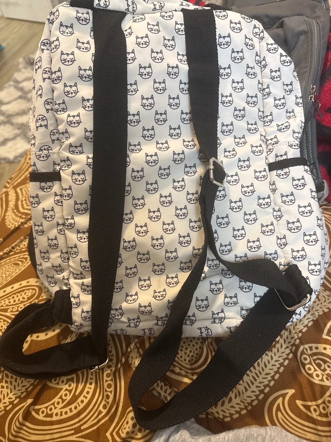 White backpack with black cat print