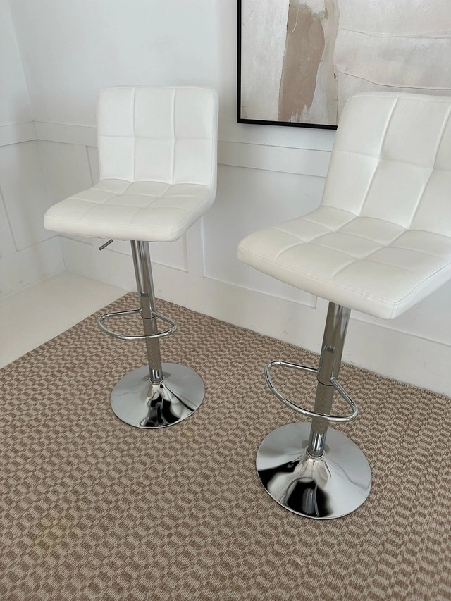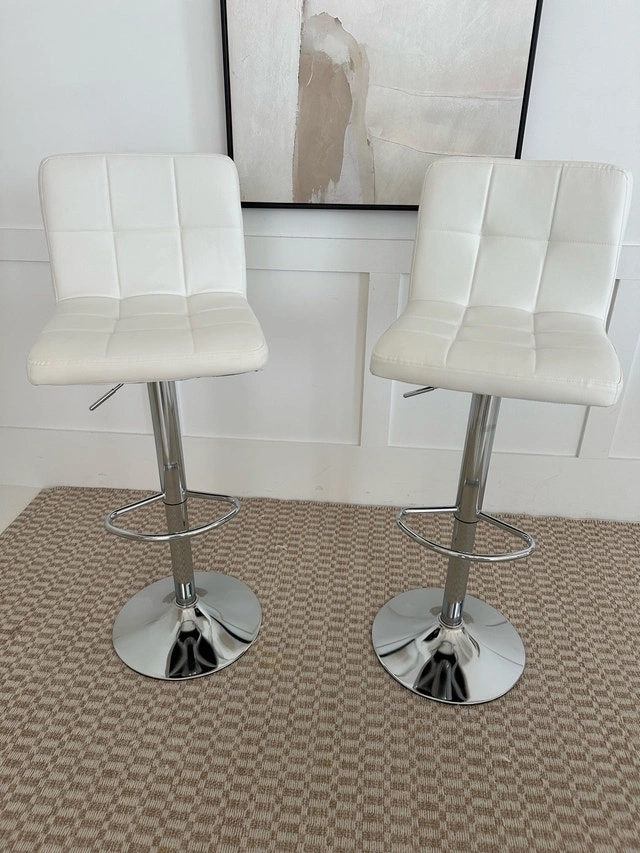 Add a modern touch to your kitchen or bar area with these sleek white bar stools, featuring a comfortable, quilted seat design and a sturdy chrome base. The stools are new in boxes, offering adjustable height for a customized fit. If the ad is up, the stools are available and ready to elevate your space. Adjustable Height, Quilted Seat Design, Chrome Base, White Colour. Perfect for counter height islands or bars.