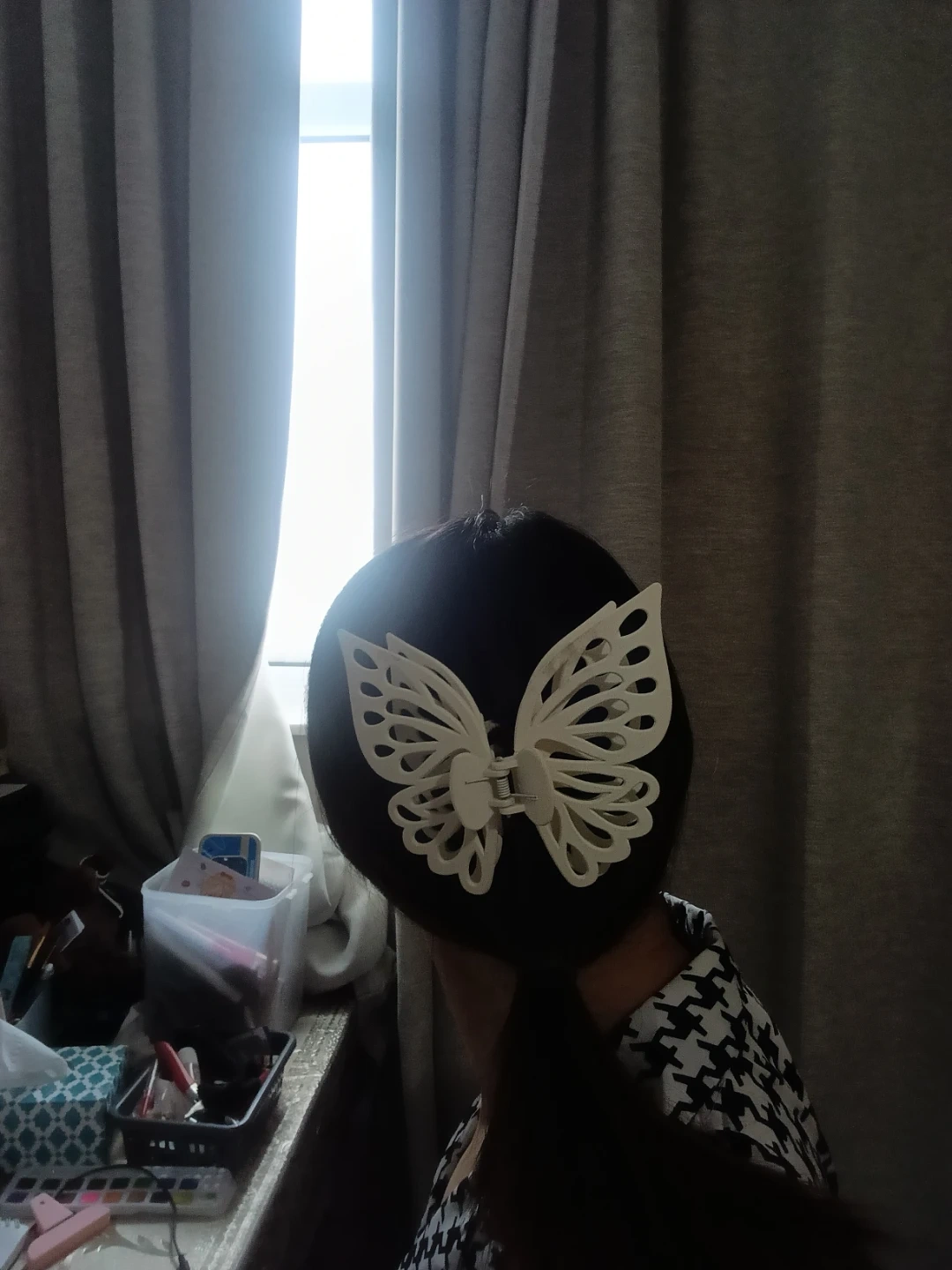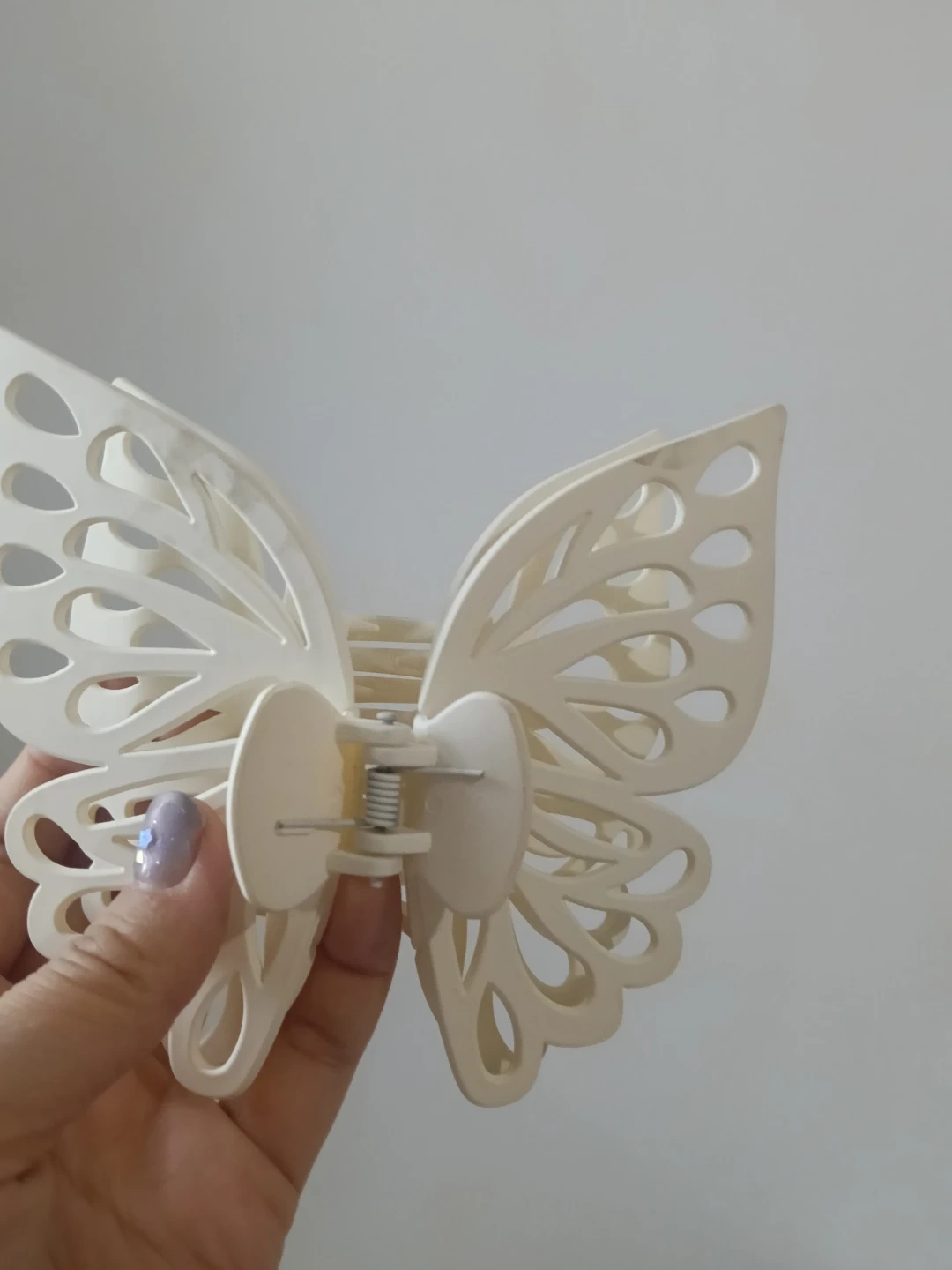 A cute white butterfly claw clip for your hair. It's made of plastic and has a strong grip. Great for holding up your hair or adding a decorative touch!