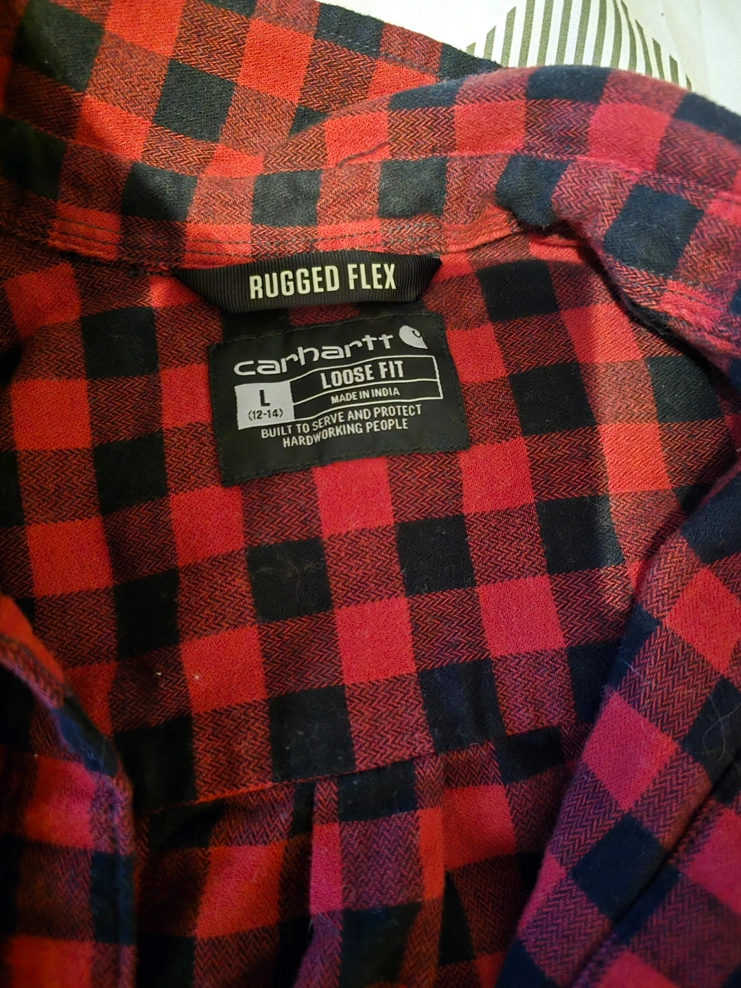 This is a Carhartt Rugged Flex loose fit long-sleeved shirt. It's a red and black buffalo plaid pattern. Button-up front with buttons on the cuffs. Made in India. Size Large (12-14).