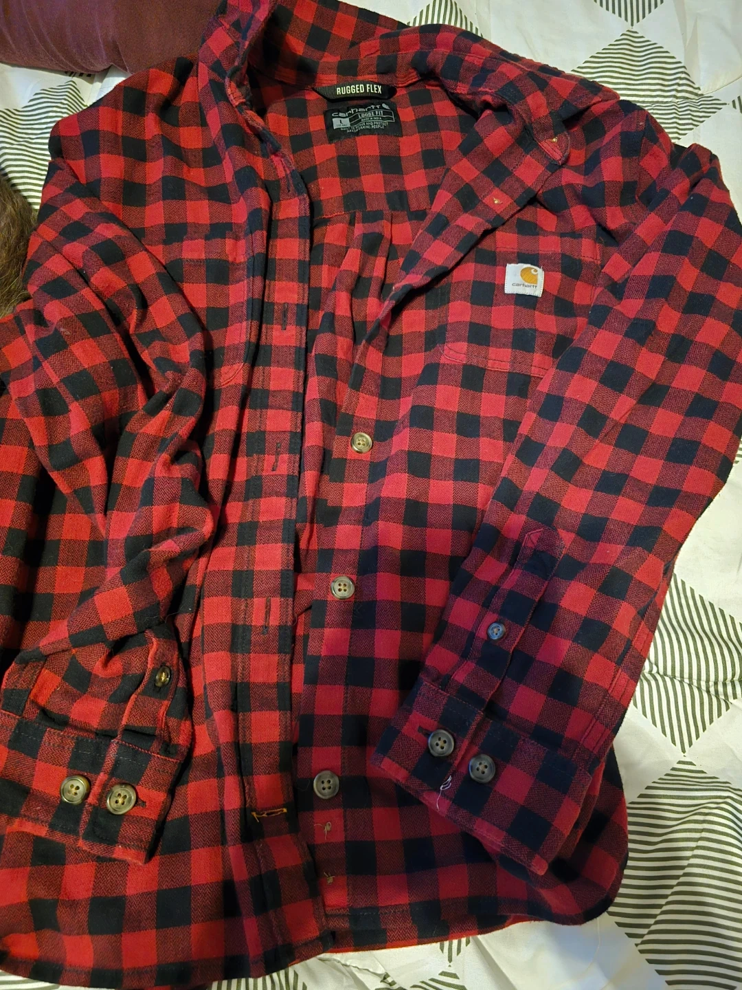 This is a Carhartt Rugged Flex loose fit long-sleeved shirt. It's a red and black buffalo plaid pattern. Button-up front with buttons on the cuffs. Made in India. Size Large (12-14).