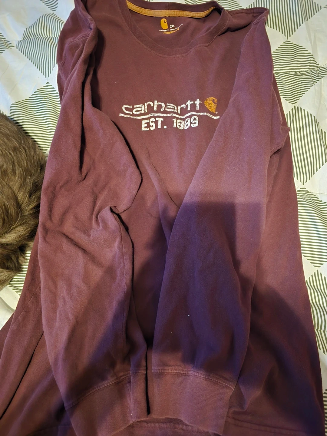 Carhartt long sleeve t-shirt in a 2XL relaxed fit. This maroon shirt features the Carhartt est. 1889 logo. Made in El Salvador. It's a comfortable, durable shirt for everyday wear.