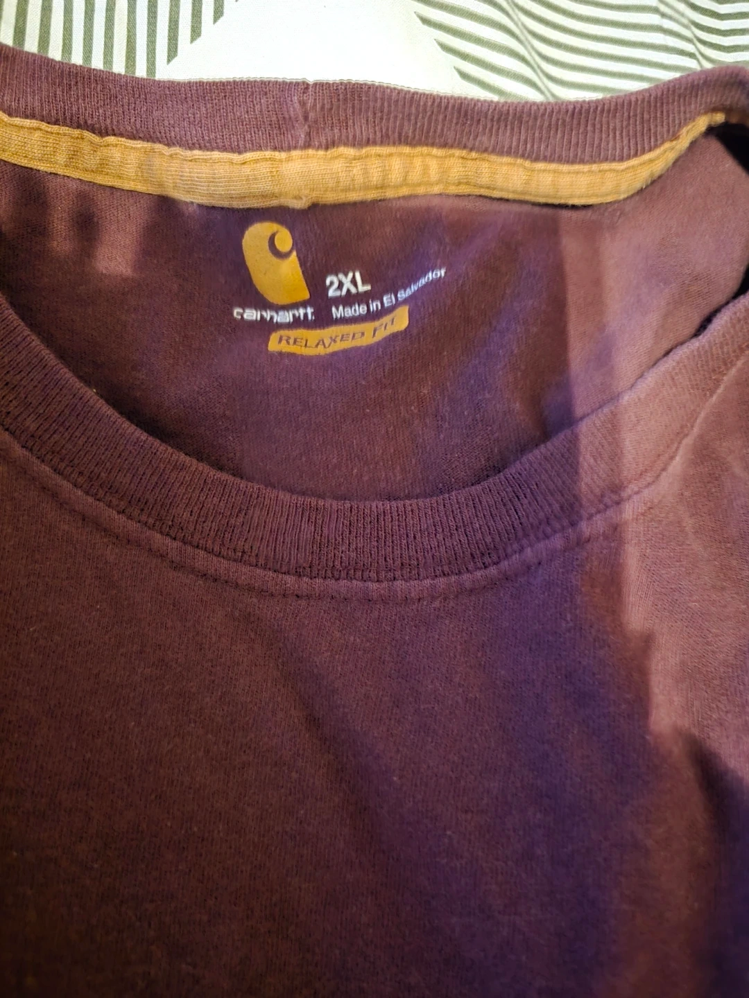 Carhartt long sleeve t-shirt in a 2XL relaxed fit. This maroon shirt features the Carhartt est. 1889 logo. Made in El Salvador. It's a comfortable, durable shirt for everyday wear.