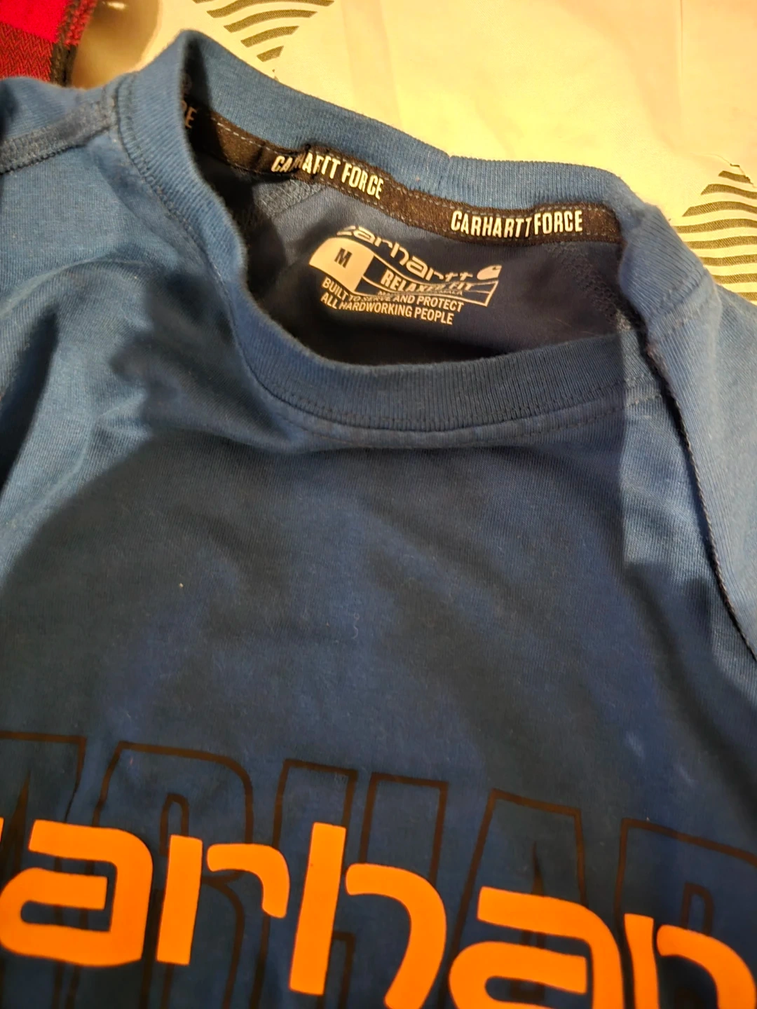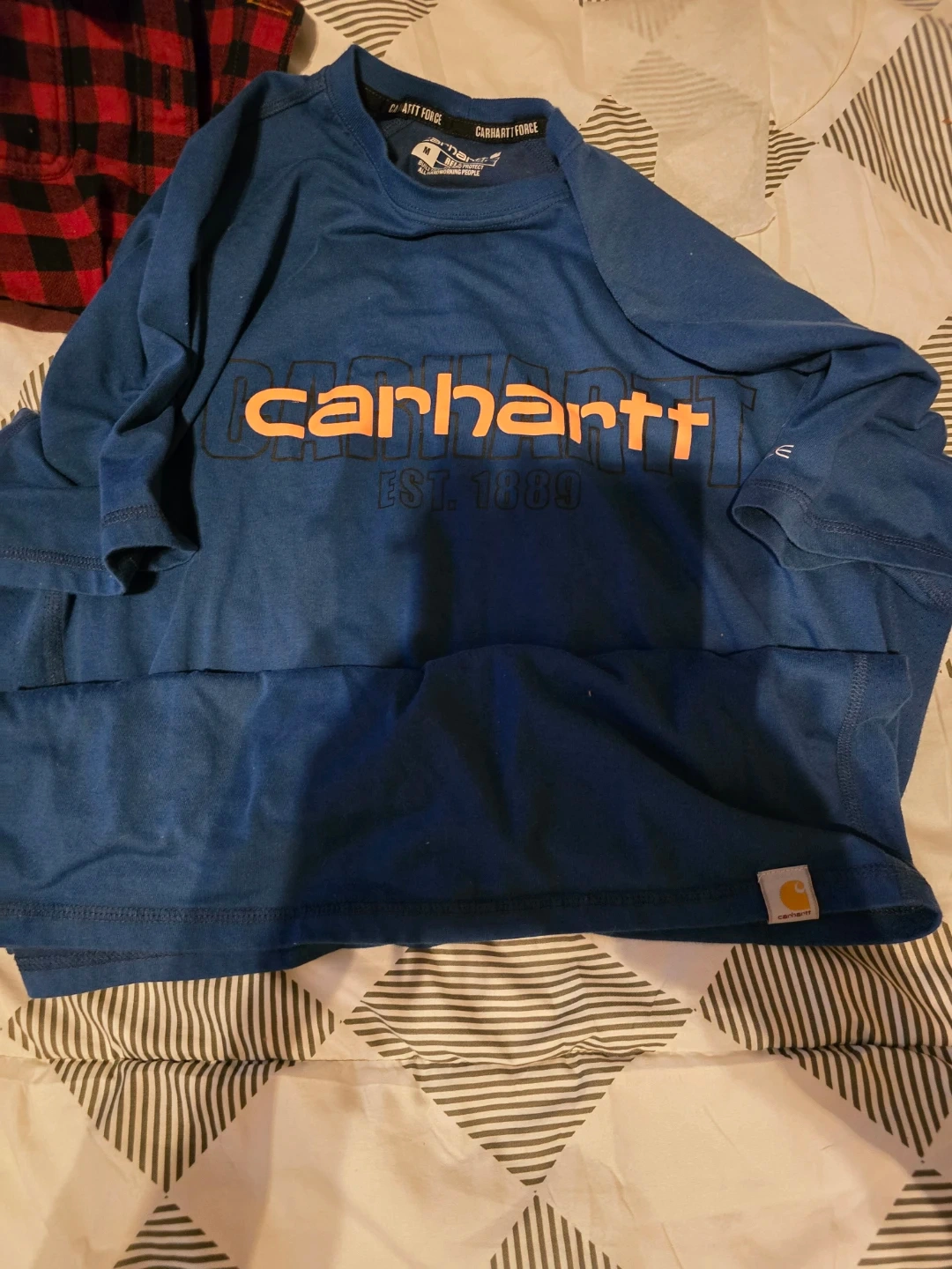 Blue Carhartt Force t-shirt with "carhartt" logo across the chest. "EST. 1889" is printed below the logo. Size medium. Relaxed fit, built to keep you dry and protected.