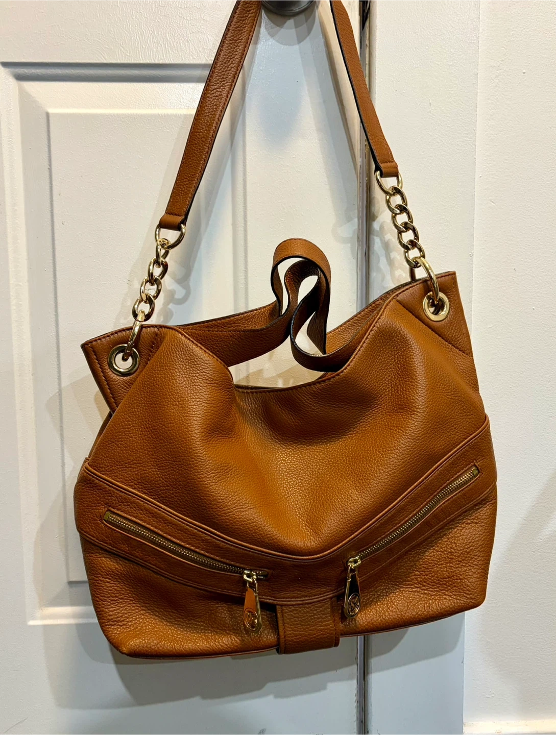 This Michael Kors shoulder bag is crafted from rich brown pebbled leather. It features gold-tone hardware and a secure magnetic snap closure. The interior lining is printed with the Michael Kors logo. This bag is perfect for everyday use!